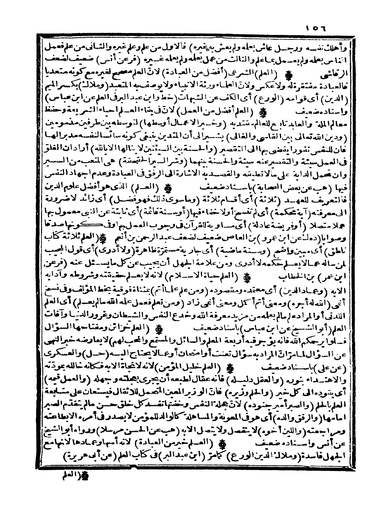 (الْعلم) الَّذِي هُوَ أفضل عُلُوم الدّين فالتعريف للْعهد (ثَلَاثَة) أَي أَقسَام ثَلَاثَة (وَمَا سوى ذَلِك فَهُوَ فضل) أَي زَائِد لَا ضَرُورَة إِلَى مَعْرفَته (آيَة محكمَة) أَي لم تنسخ أَو لإخفاء فِيهَا (أَو سنة قَائِمَة) أَي ثَابِتَة عَن النَّبِي مَعْمُول بهَا عملا مُتَّصِلا (أَو فَرِيضَة عادلة) أَي مُسَاوِيَة لِلْقُرْآنِ فِي وجوب الْعَمَل بهَا وَفِي كَونهَا صدقا وصواباً (د هـ ك عَن ابْن عَمْرو) بن الْعَاصِ // ضَعِيف // لضعف عبد الرَّحْمَن بن أنعم