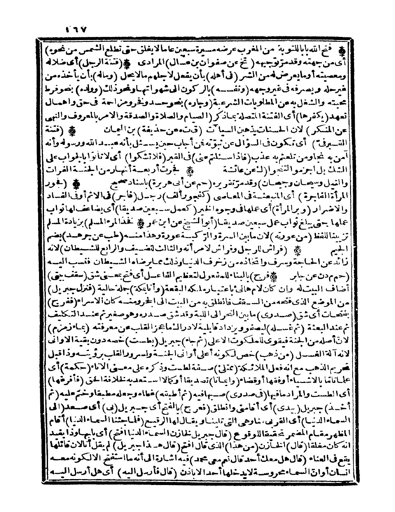 فرج) بِالْبِنَاءِ للْمَفْعُول لتعظيم الْفَاعِل أَي فتح بِمَعْنى شقّ (سقف بَيْتِي) أضَاف الْبَيْت لَهُ وَإِن كَانَ لأم هَانِئ بِاعْتِبَار ملكه الْبقْعَة (وَأَنا بِمَكَّة) جملَة حَالية (فَنزل جِبْرِيل) من الْموضع الَّذِي فَتحه من السّقف فَانْطَلق بِهِ من الْبَيْت إِلَى الْحجر وَمِنْه كَانَ الْإِسْرَاء (فَفرج) بِفَتَحَات أَي شقّ (صَدْرِي) مَا بَين النَّحْر إِلَى اللبة وَقد شقّ صَدره وَهُوَ صَغِير ثمَّ عِنْد التَّكْلِيف ثمَّ عِنْد الْبعْثَة (ثمَّ غسله) ليصفو ويزداد قابلية لإدراك مَا عجز الْقلب عَن مَعْرفَته (بِمَاء زَمْزَم) لن أَصله من الْجنَّة فيقوى للملكوت الْأَعْلَى (ثمَّ جَاءَ) جِبْرِيل (بطست) خصّه دون بَقِيَّة الْأَوَانِي لِأَنَّهُ آلَة الْغسْل (من ذهب) خص لكَونه أَعلَى أواني الْجنَّة ولسرور الْقلب بِرُؤْيَتِهِ وَذَا قبل تَحْرِيم الذَّهَب مَعَ أَنه فعل الْمَلَائِكَة (ممتلئ) صفة لطست وَذكره على معنى الْإِنَاء (حِكْمَة) أَي علما تَاما بالأشياء أوفقها أَو قَضَاء (وإيماناً) تَصْدِيقًا أَو كمالاً استعد بِهِ لخلافة الْحق (فأفرغها) أَي الطست وَالْمرَاد مَا فِيهَا (فِي صَدْرِي) صبهاً فِيهِ (ثمَّ أطبقه) غطاه وَجعله مطبقاً وَختم عَلَيْهِ (ثمَّ أَخذ) جِبْرِيل (بيَدي) أَي أقامني وَانْطَلق (فعرج) بِالْفَتْح أَي جِبْرِيل (بِي) أَي صعد (إِلَى السَّمَاء الدُّنْيَا) أَي الْقُرْبَى منا وَهِي الَّتِي تلينا وَيُقَال لَهَا الرقيع (فَلَمَّا جِئْنَا السَّمَاء الدُّنْيَا) أَقَامَ الْمظهر مقَام الْمُضمر تَحْقِيقا للوقوع (قَالَ جِبْرِيل لخازن السَّمَاء الدُّنْيَا افْتَحْ) أَي بَابهَا وَذَا يُفِيد أَنه كَانَ مغلفاً (قَالَ) الخازن (من هَذَا) الَّذِي قَالَ افْتَحْ (قَالَ هَذَا جِبْرِيل) لم يقل أَنا لِأَن قَائِلهَا يَقع فِي العناء (قَالَ هَل مَعَك أحد قَالَ نعم معي مُحَمَّد) فِيهِ إِشَارَة إِلَى أَنه مَا استفتح إِلَّا لكَونه مَعَه إِنْسَان أَو أَن السَّمَاء محروسة لَا يدخلهَا أحد إِلَّا بِإِذن (قَالَ فَأرْسل إِلَيْهِ) أَي هَل أرسل إِلَيْهِ
