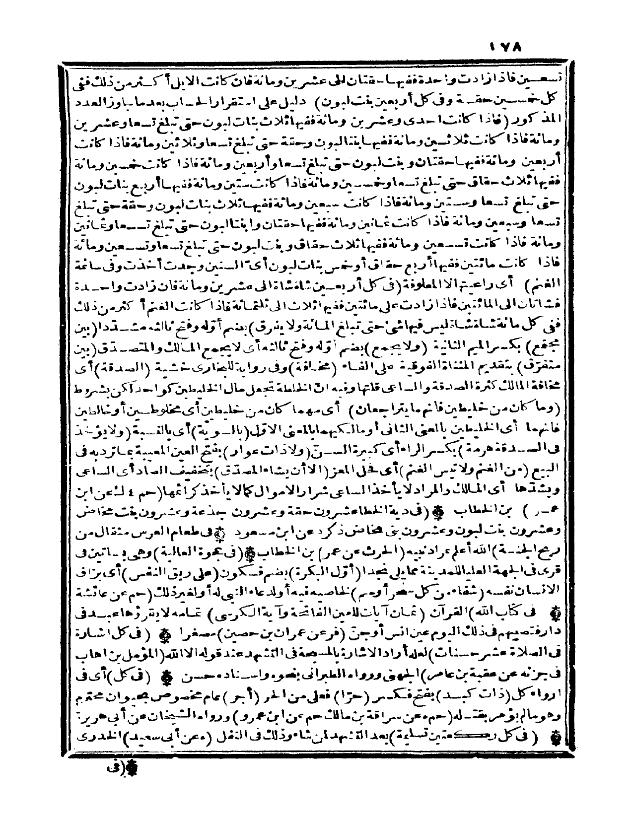 تسعين فَإِذا زَادَت وَاحِدَة فَفِيهَا حقتان إِلَى عشْرين وَمِائَة فَإِن كَانَت الْإِبِل أَكثر من ذَلِك فَفِي كل خمسين حقة وَفِي كل أَرْبَعِينَ بنت لبون) دَلِيل على اسْتِقْرَار الْحساب بعد مَا جَاوز الْعدَد الْمَذْكُور (فَإِذا كَانَت إِحْدَى وَعشْرين وَمِائَة فَفِيهَا ثَلَاث بَنَات لبون حَتَّى تبلغ تسعا وَعشْرين وَمِائَة فَإِذا كَانَت ثَلَاثِينَ وَمِائَة فَفِيهَا بِنْتا لبون وحقة حَتَّى تبلغ تسعا وَثَلَاثِينَ وَمِائَة فَإِذا كَانَت أَرْبَعِينَ وَمِائَة فَفِيهَا حقتان وَبنت لبون حَتَّى تبلغ تسعا وَأَرْبَعين وَمِائَة فَإِذا كَانَت خمسين وَمِائَة فَفِيهَا ثَلَاث حقاق حَتَّى تبلغ تسعا وَخمسين وَمِائَة فإ " ذَا كَانَت سِتِّينَ وَمِائَة فَفِيهَا أَربع بَنَات لبون حَتَّى تبلغ تسعا وَسِتِّينَ وَمِائَة فَإِذا كَانَت سبعين وَمِائَة فَفِيهَا ثَلَاث بَنَات لبون وحقة حَتَّى تبلغ تسعا وَسبعين وَمِائَة فَإِذا كَانَت ثَمَانِينَ وَمِائَة فَفِيهَا حقتان وابنتا لبون حَتَّى تبلغ تسعا وَثَمَانِينَ وَمِائَة فَإِذا كَانَت تسعين وَمِائَة فَفِيهَا ثَلَاث حقاق وَبنت لبون حَتَّى تبلغ تسعا وَتِسْعين وَمِائَة فَإِذا كَانَت مِائَتَيْنِ فَفِيهَا أَربع حقاق أَو خمس بَنَات لبون أَي السنين وجدت أخذت وَفِي سَائِمَة الْغنم) أَي راعيتها لَا المعلوفة (فِي كل أَرْبَعِينَ شَاة شَاة إِلَى عشْرين وَمِائَة فَإِن زَادَت وَاحِدَة فشاتان إِلَى الْمِائَتَيْنِ فَإِذا زَادَت على مِائَتَيْنِ فَفِيهَا ثَلَاث إِلَى ثلثمِائة فَإِذا كَانَت الْغنم أَكثر من ذَلِك فَفِي كل مائَة شَاة شَاة لَيْسَ فِيهَا شَيْء حَتَّى تبلغ الْمِائَة وَلَا يفرق) بِضَم أَوله وَفتح ثالثه مشدداً (بَين مُجْتَمع) بِكَسْر الْمِيم الثَّانِيَة (وَلَا يجمع) بِضَم أَوله وَفتح ثالثه أَي لَا يجمع الْمَالِك والمتصدق (بَين متفرق) بِتَقْدِيم الْمُثَنَّاة الْفَوْقِيَّة على الْفَاء (مَخَافَة) وَفِي رِوَايَة للْبُخَارِيّ خشيَة (الصَّدَقَة) أَي مَخَافَة الْمَالِك كَثْرَة الصَّدَقَة والساعي قلتهَا وَفِيه أَن الْخلطَة تجْعَل مَال الخليطين كواحد لَكِن بِشُرُوط (وَمَا كَانَ من خليطين فَإِنَّهُمَا يتراجعان) أَي مهما كَانَ من خليطين أَي مخلوطين أَو خالطين فَإِنَّهُمَا أَي الخليطين بِالْمَعْنَى الثَّانِي أَو ماليكهما بِالْمَعْنَى الأول (بِالسَّوِيَّةِ) أَي بِالنِّسْبَةِ (وَلَا يُؤْخَذ فِي الصَّدَقَة هرمة) بِكَسْر الرَّاء أَي كَبِيرَة السن (وَلَا ذَات عوار) بِفَتْح الْعين المعيبة بِمَا ترد بِهِ فِي البيع (من الْغنم وَلَا تَيْس الْغنم) أَي فَحل الْمعز (إِلَّا أَن يَشَاء الْمُصدق) بتَخْفِيف الصَّاد أَي السَّاعِي وبشدها أَي الْمَالِك وَالْمرَاد لَا يَأْخُذ السَّاعِي شرار الْأَمْوَال كَمَا لَا يَأْخُذ كرائمها (حم 4 ك عَن ابْن عمر) بن الْخطاب