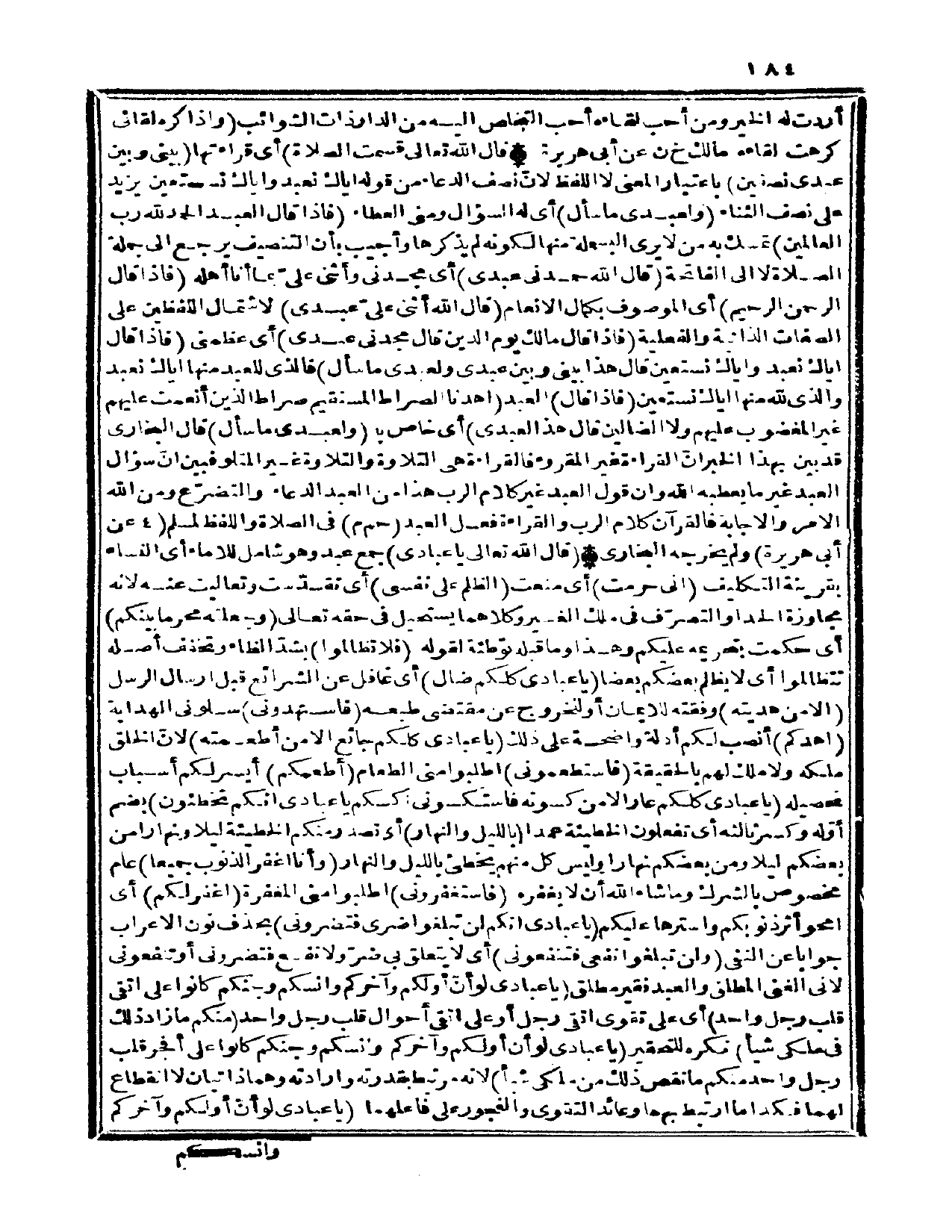 (قَالَ الله تَعَالَى يَا عبَادي) جمع عبد وَهُوَ شَامِل للإماء أَي النِّسَاء بِقَرِينَة التَّكْلِيف (إِنِّي حرمت) أَي منعت (الظُّلم على نَفسِي) أَي تقدست وَتَعَالَيْت عَنهُ لِأَنَّهُ مجاوز الْحَد أَو التَّصَرُّف فِي ملك الْغَيْر وَكِلَاهُمَا يَسْتَحِيل فِي حَقه تَعَالَى (وَجَعَلته محرما بَيْنكُم) أَي حكمت بِتَحْرِيمِهِ عَلَيْكُم وَهَذَا وَمَا قبله تَوْطِئَة لقَوْله (فَلَا تظالموا) بشد الظَّاء وتخفف أَصله تتظالموا أَي لَا يظلم بَعْضكُم بَعْضًا (يَا عبَادي كلكُمْ ضال) أَي غافل عَن الشَّرَائِع قبل إرْسَال الرُّسُل (إِلَّا من هديته) وفقته للْإيمَان أَو لِلْخُرُوجِ عَن مُقْتَضى طبعه (فاستهدوني) سلوني الْهِدَايَة) (اهدكم) أنصب لكم أَدِلَّة وَاضِحَة على ذَلِك (يَا عبَادي كلكُمْ جَائِع إِلَّا من أطعمته) لِأَن الْخلق ملكه وَلَا ملك لَهُم بِالْحَقِيقَةِ (فاستطعموني) اطْلُبُوا مني الطَّعَام (أطْعمكُم) أيسر لكم أَسبَاب تَحْصِيله (يَا عبَادي كلكُمْ عَار إِلَّا من كسوته فاستكسوني أكسكم يَا عبَادي إِنَّكُم تخطئون) بِضَم أَوله وَكسر ثالثه أَي تَفْعَلُونَ الْخَطِيئَة عمدا (بِاللَّيْلِ وَالنَّهَار) أَي تصدر مِنْكُم الْخَطِيئَة لَيْلًا وَنَهَارًا من بَعْضكُم لَيْلًا وَمن بَعْضكُم نَهَارا وَلَيْسَ كل مِنْهُم يُخطئ بِاللَّيْلِ وَالنَّهَار (وَأَنا أَغفر الذُّنُوب جَمِيعًا) عَام مَخْصُوص بالشرك وَمَا شَاءَ الله أَن لَا يغفره (فاستغفروني) اطْلُبُوا مني الْمَغْفِرَة (اغْفِر لكم) أَي امحو أثر ذنوبكم واسترها عَلَيْكُم (يَا عبَادي إنهكم لن تبغلوا ضري فتضروني) بِحَذْف نون الْأَعْرَاب جَوَابا عَن النَّفْي (وَلنْ تبلغوا نفعي فتنفعوني) أَي لَا يتَعَلَّق بِي ضرّ وَلَا نفع فتضروني أَو تنفعوني لِأَنِّي الْغَنِيّ الْمُطلق وَالْعَبْد فَقير مُطلق (يَا عبَادي لَو أَن أولكم وآخركم وأنسكم وجنكم كَانُوا على اتَّقى قلب رجل وَاحِد) أَي على تقوى اتَّقى رجل أَو على اتَّقى أَحْوَال قلب رجل وَاحِد (مِنْكُم مَا زَاد ذَلِك فِي ملكي شيأ) نكره للتحقير (يَا عبَادي لَو أَن أولكم وآخركم وأنسكم وجنكم كَانُوا على أفجر قلب رجل وَاحِد مِنْكُم مَا نقص ذَلِك من ملكي شيأ) لِأَنَّهُ مُرْتَبِط بقدرته وإرادته وهما ذَا تيان لَا انْقِطَاع لَهما فَكَذَا مَا ارْتبط بهما وعائد التَّقْوَى والفجور على فاعلهما (يَا عبَادي لَو أَن أولكم وآخركم