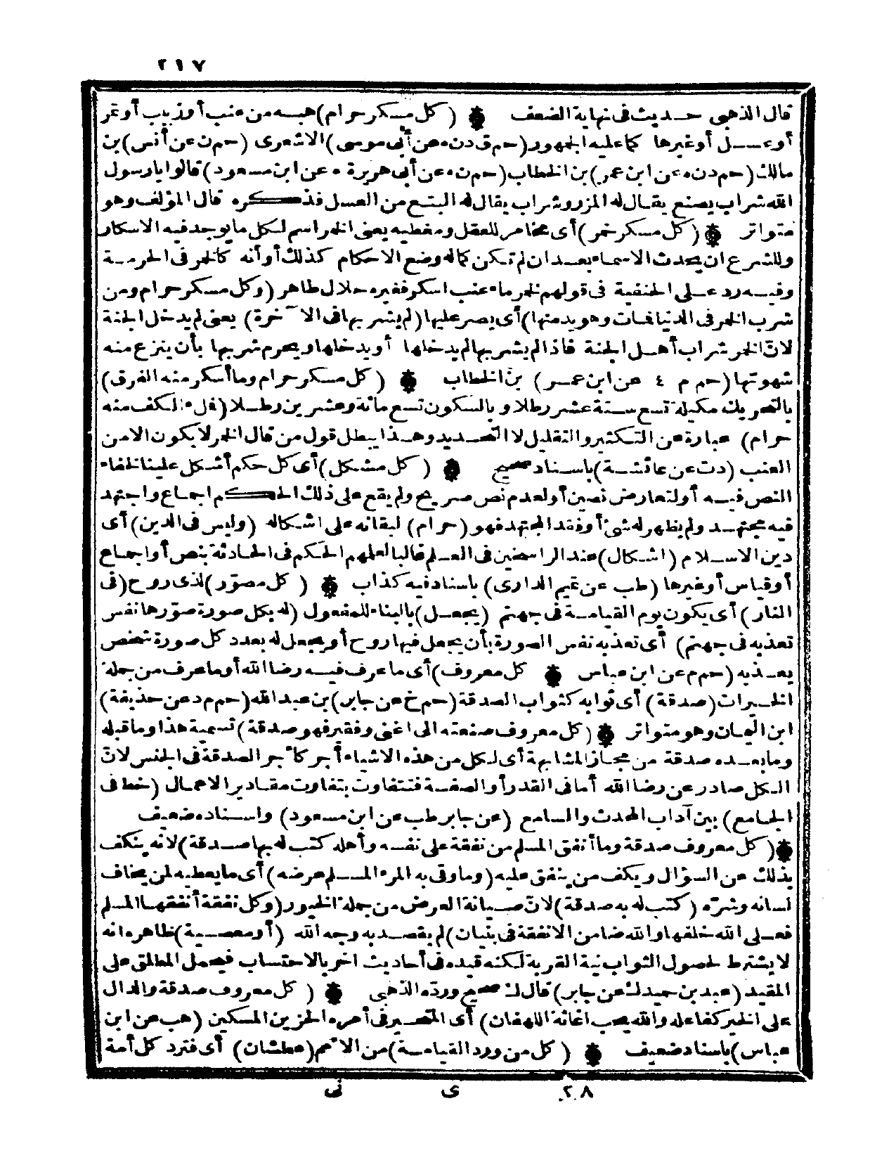 (كل مُسكر حرَام) هبه من عِنَب أَو زبيب أَو تمر أَو عسل أَو غَيرهَا كَمَا عَلَيْهِ الْجُمْهُور (حم ق د ن هـ عَن أبي مُوسَى) الْأَشْعَرِيّ (حم ن عَن أنس) بن مَالك (حم د ن هـ عَن ابْن عمر) بن الْخطاب (حم ن هـ عَن أبي هُرَيْرَة هـ عَن ابْن مَسْعُود) قَالُوا يَا رَسُول الله شراب يصنع يُقَال لَهُ المزر وشراب يُقَال لَهُ البتع من الْعَسَل فَذكره قَالَ الْمُؤلف وَهُوَ متواتر