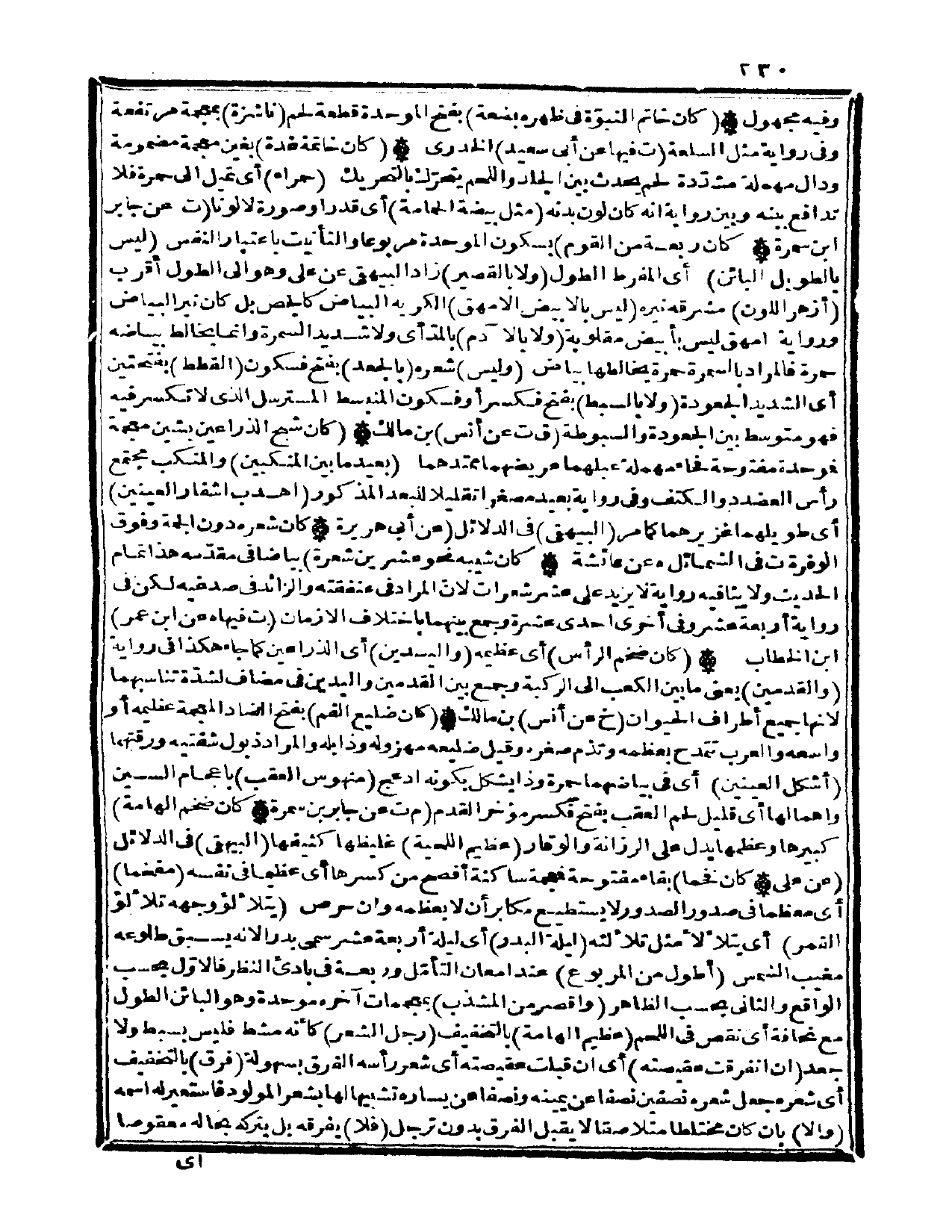 كَانَ فخماً) بفاء مَفْتُوحَة مُعْجمَة سَاكِنة أفْصح من كسرهَا أَي عَظِيما فِي نَفسه (مفخماً) أَي مُعظما فِي صُدُور الصُّدُور لَا يَسْتَطِيع مكابر أَن لَا يعظمه وَإِن حرص (يتلألؤ وَجهه تلألؤ الْقَمَر) أَي يتلألأ مثل تلألئه (لَيْلَة الْبَدْر) أَي لَيْلَة أَرْبَعَة عشر سمى بَدْرًا لِأَنَّهُ يسْبق طلوعه مغيب الشَّمْس (أطول من المربوع) عِنْد إمعان التَّأَمُّل وربعة فِي بادئ النّظر فَالْأول بِحَسب الْوَاقِع وَالثَّانِي بِحَسب الظَّاهِر (واقصر من المشذب) بمعجمات آخِره مُوَحدَة وَهُوَ الْبَائِن الطول مَعَ نحافة أَي نقص فِي اللَّحْم (عَظِيم الهامة) بِالتَّخْفِيفِ (رجل الشّعْر) كَأَنَّهُ مشط فَلَيْسَ بسبط وَلَا جعد (أَن انفرقت عقيصته) أَي أَن قبلت عقيصته أَي شعر رَأسه الْفرق بسهولة (فرق) بِالتَّخْفِيفِ أَي شعره جعل شعره نِصْفَيْنِ نصفا عَن يَمِينه وَنصفا عَن يسَاره تشيها لَهَا بِشعر الْمَوْلُود فأستعير لَهُ اسْمه (وَإِلَّا) بِأَن كَانَ مختلطاً متلاصقاً لَا يقبل الْفرق بِدُونِ ترجل (فَلَا) يفرقه بل يتْركهُ بِحَالهِ معقوصاً