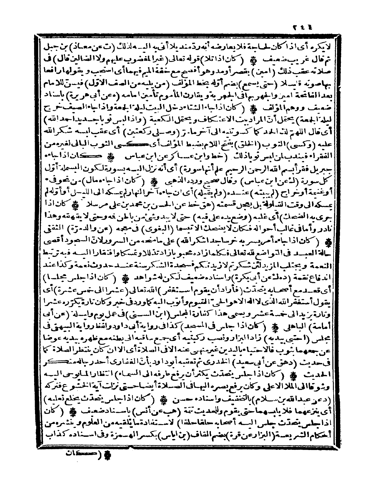 (كَانَ إِذا جلس فِي الْمَسْجِد) كَذَا فِي رِوَايَة أبي دَاوُد وَلَفظ رِوَايَة الْبَيْهَقِيّ فِي مجْلِس (احتبى بيدَيْهِ) زَاد الْبَزَّار وَنصب رُكْبَتَيْهِ أَي جمع سَاقيه إِلَى بَطْنه مَعَ ظَهره بيدَيْهِ عوضا عَن جَمعهمَا بِثَوْب فالاحتباء باليدين غير منهى عَنهُ إِلَّا فِي الصَّلَاة أَي إِلَّا إِن كَانَ ينْتَظر الصَّلَاة كَمَا فِي حَدِيث (د هق عَن أبي سعيد) الْخُدْرِيّ ثمَّ تعقبه أَبُو دَاوُد بِأَن الْغِفَارِيّ أحد رِجَاله // مُنكر الحَدِيث //