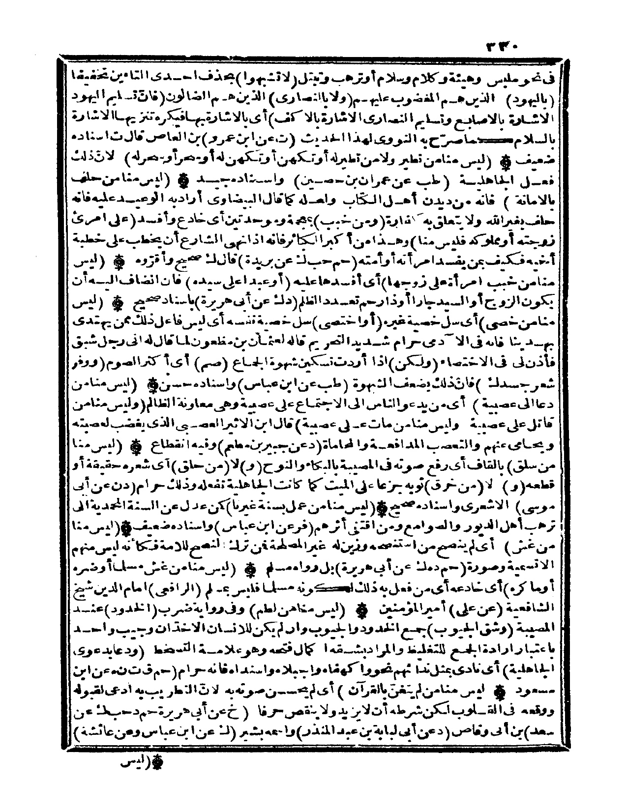 فِي نَحْو ملبس وهيئة وَكَلَام وَسَلام أَو ترهب وتبتل (لَا تشبهوا) بِحَذْف احدى التَّاءَيْنِ تَخْفِيفًا (باليهود) الَّذين هم المغضوب عَلَيْهِم (وَلَا بالنصارى) الَّذين هم الضالون (فان تَسْلِيم الْيَهُود الاشارة بالاصابع وَتَسْلِيم النَّصَارَى الاشارة بالاكف) أَي بالاشارة بهَا فَيكْرَه تَنْزِيها الاشارة بِالسَّلَامِ كَمَا صرح بِهِ النَّوَوِيّ لهَذَا الحَدِيث (ت عَن ابْن عَمْرو) بن الْعَاصِ قَالَ ت اسناده ضَعِيف