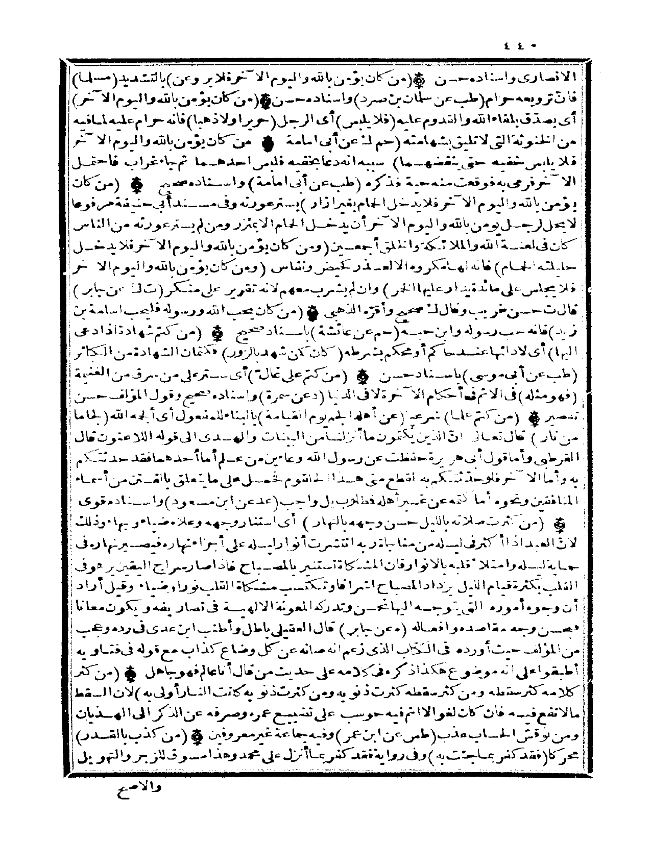 (من كَانَ يُؤمن بِاللَّه وَالْيَوْم الآخر فَلَا يدْخل الْحمام بِغَيْر ازار) يستر عَوْرَته وَفِي مُسْند أبي حنيفَة مَرْفُوعا لَا يحل لرجل يُؤمن بِاللَّه وَالْيَوْم الآخر أَن يدْخل الْحمام الا بمئزر وَمن لم يستر عَوْرَته من النَّاس كَانَ فِي لعنة الله وَالْمَلَائِكَة والخلق أَجْمَعِينَ (وَمن كَانَ يُؤمن بِاللَّه وَالْيَوْم الآخر فَلَا يدْخل حليلته الْحمام) فانه لَهَا مَكْرُوه الا لعذر كحيض ونفاس (وَمن كَانَ يُؤمن بِاللَّه وَالْيَوْم الآخر فَلَا يجلس على مائدة ويدارعليها الْخمر) وان لم يشرب مَعَهم لانه تَقْرِير على مُنكر (ت ك عَن جَابر) قَالَ ت حسن غَرِيب وَقَالَ ك صَحِيح وَأقرهُ الذَّهَبِيّ