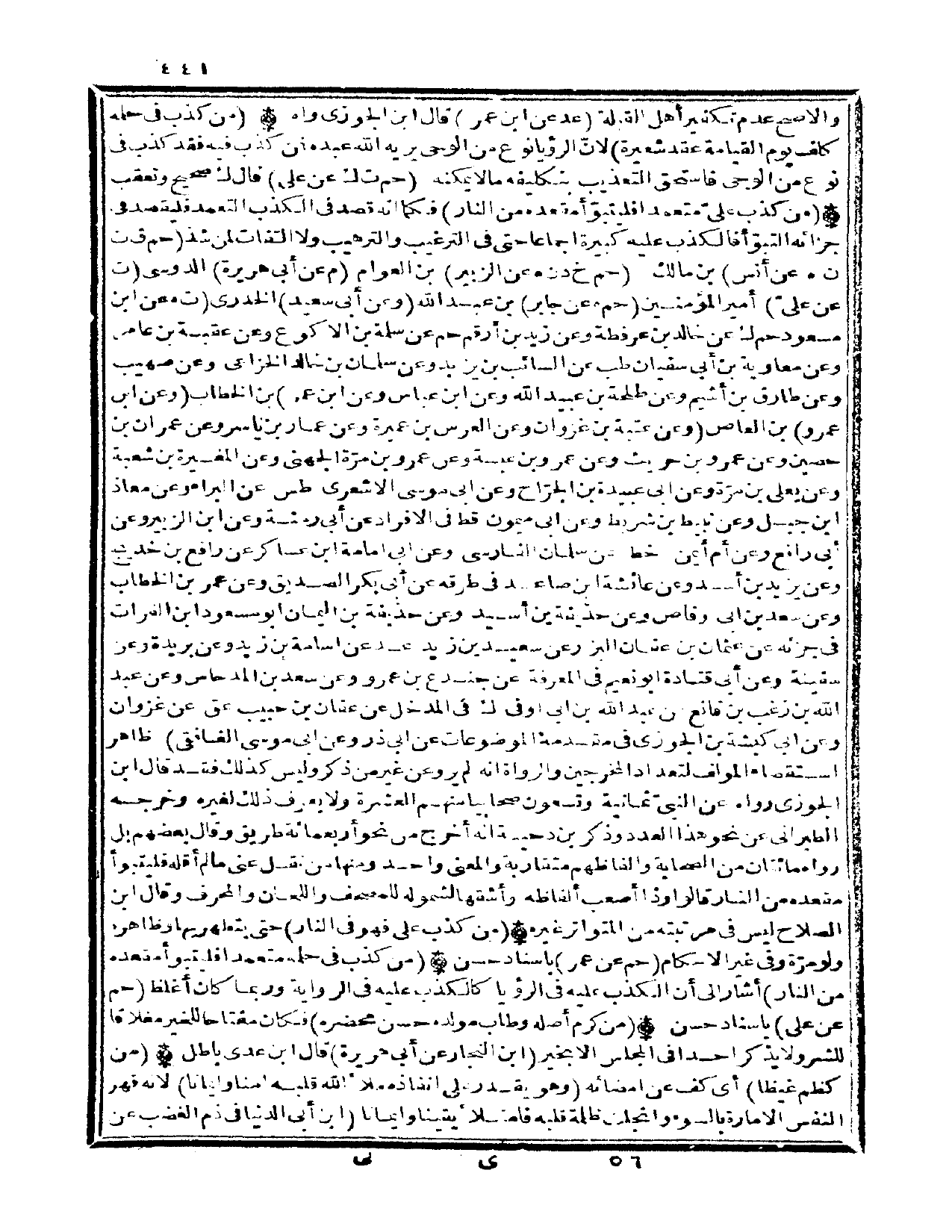 (من كذب عَليّ متعمد فَليَتَبَوَّأ مَقْعَده من النَّار) فَكَمَا انه قصد فِي الْكَذِب التعمد فليقصد فِي جَزَائِهِ التبوأ فالكذب عَلَيْهِ كَبِيرَة اجماعا حَتَّى فِي التَّرْغِيب والترهيب وَلَا الْتِفَات لمن شَذَّ (حم ق ت ن هـ عَن أنس) بن مَالك (حم خَ دن هـ عَن الزبير) بن الْعَوام (م عَن أبي هُرَيْرَة) الدوسي (ت عَن عَليّ) أَمِير الْمُؤمنِينَ (حم هـ عَن جَابر) بن عبد الله (وَعَن أبي سعيد) الْخُدْرِيّ (ت هـ عَن ابْن مَسْعُود حم ك عَن خَالِد بن عرفطة عَن زيد بن أَرقم حم عَن سَلمَة بن الاكوع وَعَن عقبَة بن عَامر وَعَن مُعَاوِيَة بن أبي سُفْيَان طب عَن السَّائِب بن يزِيد وَعَن سلمَان بن خَالِد الْخُزَاعِيّ وَعَن صُهَيْب وَعَن طَارق بن أَشْيَم وَعَن طَلْحَة بن عبيد الله وَعَن ابْن عَبَّاس وَعَن ابْن عمر) بن الْخطاب (وَعَن ابْن عَمْرو) بن الْعَاصِ (وَعَن عتبَة بن غَزوَان وَعَن الْعرس بن عميرَة عَن عمار بن يَاسر وَعَن عمرَان بن حُصَيْن وَعَن عَمْرو بن حُرَيْث عَن عَمْرو بن عبسة وَعَن عَمْرو بن مرّة الْجُهَنِيّ وَعَن الْمُغيرَة بن شُعْبَة وَعَن يعلى بن مرّة وَعَن ابي عُبَيْدَة بن الْجراح وَعَن ابي مُوسَى الاشعري طس عَن الْبَراء وَعَن معَاذ ابْن جبل وَعَن نبيط بن شربط وَعَن ابي مَيْمُون قطّ فِي الافراد عَن أبي رمثة وَعَن ابْن الزبير وَعَن أبي رَافع وَعَن أم أَيمن خطّ عَن سلمَان الْفَارِسِي وَعَن ابي امامة ابْن عَسَاكِر عَن رَافع بن خديج وَعَن يزِيد بن أَسد عَن عَائِشَة ابْن صاعد فِي طرقه عَن أبي بكر الصّديق وَعَن عمر بن الْخطاب وَعَن سعد بن أبي وَقاص وَعَن حُذَيْفَة بن أسيد وَعَن حُذَيْفَة بن الْيَمَان أَبُو مَسْعُود ابْن الْفُرَات فِي جزئه عَن عُثْمَان بن عَفَّان البزر عَن سعيد بن زيد عد عَن اسامة بن زيد وَعَن بُرَيْدَة وَعَن سفينة وَعَن أبي قَتَادَة ابو نعيم فِي الْمعرفَة عَن جندع بن عَمْرو وَعَن سعد بن المدحاس وَعَن عبد الله بن زغب بن قَانِع عَن عبد الله بن ابي اوفى ك فِي الْمدْخل عَن عَفَّان بن حبيب عق عَن غَزوَان وَعَن ابي كَبْشَة بن الجوزى فِي مُقَدّمَة الموضوعات عَن ابي ذَر وَعَن ابي مُوسَى الغافقي) ظَاهر استقصاء الْمُؤلف لتعداد المخرجين والرواة انه لم يرو عَن غير من ذكر وَلَيْسَ كَذَلِك فقد قَالَ ابْن الْجَوْزِيّ رَوَاهُ عَن النَّبِي ثَمَانِيَة وَتسْعُونَ صحابيا مِنْهُم الْعشْرَة وَلَا يعرف ذَلِك لغيره وخرجه الطَّبَرَانِيّ عَن نَحْو هَذَا الْعدَد وَذكر بن دحْيَة انه أخرج من نَحْو أَرْبَعمِائَة طَرِيق وَقَالَ بَعضهم بل رَوَاهُ مِائَتَان من الصَّحَابَة والفاظهم مُتَقَارِبَة وَالْمعْنَى وَاحِد وَمِنْهَا من نقل عني مَا لم أَقَله فَليَتَبَوَّأ مَقْعَده من النَّار قَالُوا وَذَا أصعب أَلْفَاظه وأشقها لشُمُوله للمصحف واللحان والمحرف وَقَالَ ابْن الصّلاح لَيْسَ فِي مرتبته من الْمُتَوَاتر غَيره