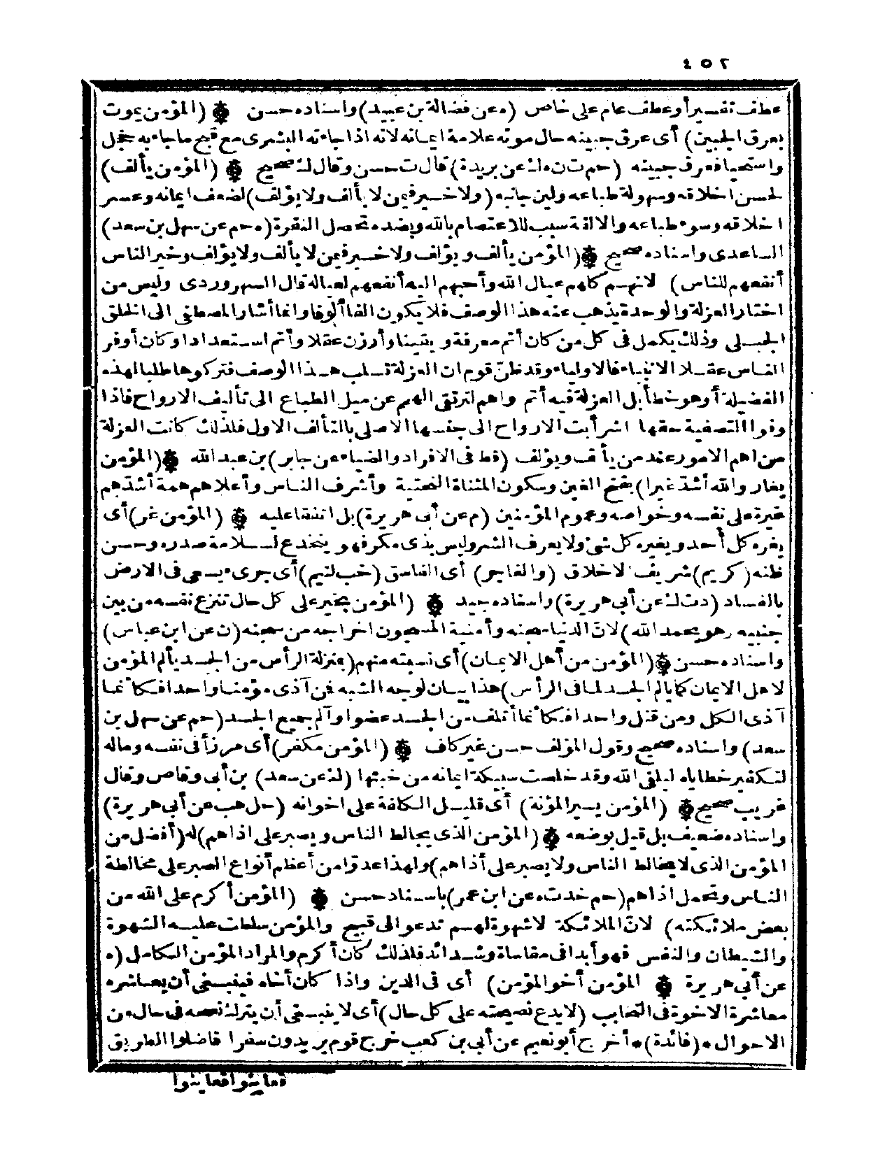 (الْمُؤمن يألف ويؤلف وَلَا خير فِيمَن لَا يألف وَلَا يؤلف وَخير النَّاس أنفعهم للنَّاس) لانهم كلهم عِيَال الله وأحبهم اليه أنفعهم لعيالة قَالَ السهروردى وَلَيْسَ من اخْتَار الْعُزْلَة والوحدة يذهب عَنهُ هَذَا الْوَصْف فَلَا يكون الْفَا ألوفا وانما أَشَارَ الْمُصْطَفى الى الْخلق الجبلى وَذَلِكَ يكمل فِي كل من كَانَ أتم معرفَة ويقينا وأرزن عقلا وَأتم اسْتِعْدَادًا وَكَانَ أوفر النَّاس عقلا الانبياء فالاولياء وَقد ظن قوم ان الْعُزْلَة تسلب هَذَا الْوَصْف فتركوها طلبا لهَذِهِ الْفَضِيلَة أَو هُوَ خطأ بل الْعُزْلَة فِيهِ أتم واهم لترتقي الهمم عَن ميل الطباع الى تأليف الارواح فاذا وفوا التصفية حَقّهَا اشرأبت الارواح الى جِنْسهَا الاصلي بالتألف الاول فَلذَلِك كَانَت الْعُزْلَة من اهم الامور عِنْد من يألف ويؤلف (قطّ فِي الافراد والضياء عَن جَابر) بن عبد الله