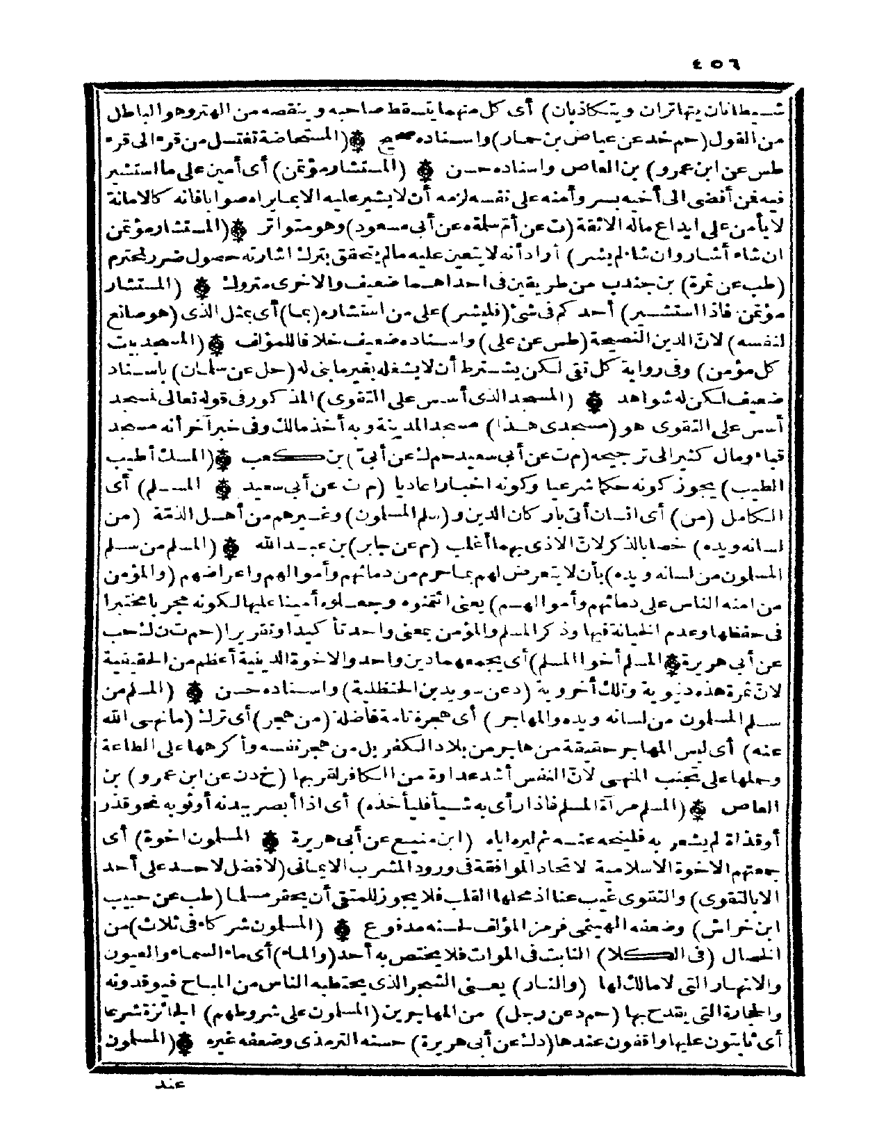 (الْمُسلم من سلم الْمُسلمُونَ من لِسَانه وَيَده وَالْمُهَاجِر) أَي هِجْرَة تَامَّة فاضلة (من هجر) أَي ترك (مَا نهى الله عَنهُ) أَي لَيْسَ المُهَاجر حَقِيقَة من هَاجر من بِلَاد الْكفْر بل من هجر نَفسه واكرهها على الطَّاعَة وَحملهَا على تجنب المنهى لَان النَّفس أَشد عَدَاوَة من الْكَافِر لقربها (خَ دن عَن ابْن عَمْرو) بن الْعَاصِ