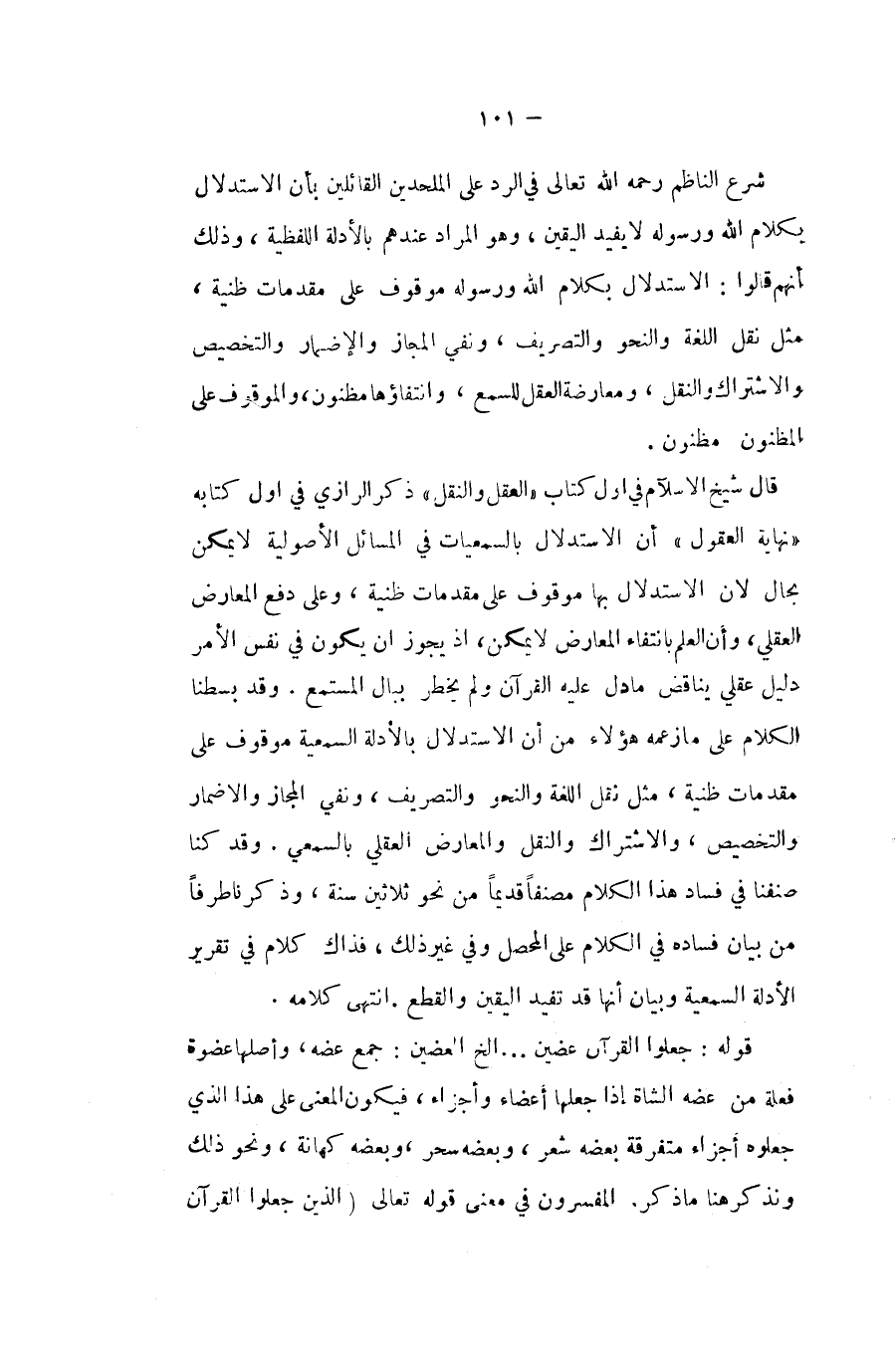 قَالَ شيخ الاسلام فِي اول الْكتاب الْعقل وَالنَّقْل ذكر الرَّازِيّ فِي اول كِتَابه نِهَايَة الْعُقُول ان الِاسْتِدْلَال بالسمعيات فِي الْمسَائِل الاصولية لَا يُمكن بِحَال لَان الِاسْتِدْلَال بهَا مَوْقُوف على مُقَدمَات ظنية وعَلى دفع الْمعَارض الْعقلِيّ وان الْعلم بِانْتِفَاء الْمعَارض لَا يُمكن اذ يجوز ان يكون فِي نفس الْأَمر دَلِيل عَقْلِي يُنَاقض مَا دلّ عَلَيْهِ الْقُرْآن وَلم يخْطر ببال المستمع وَقد بسطنا الْكَلَام على مَا زَعمه هَؤُلَاءِ من ان الِاسْتِدْلَال بالادلة السمعية مَوْقُوف على مُقَدمَات ظنية مثل نقل اللُّغَة والنحو والتصريف وَنفي الْمجَاز والاضمار والتخصيص والاشتراك وَالنَّقْل والمعارض الْعقلِيّ بالسمعي وَقد كُنَّا صنفنا فِي فَسَاد هَذَا الْكَلَام مصنفا قَدِيما من نَحْو ثَلَاثِينَ سنة وَذكرنَا طرفا من بَيَان فَسَاده فِي الْكَلَام على المحصل وَفِي غير ذَلِك فَذَاك كَلَام فِي تَقْرِير الْأَدِلَّة السمعية وَبَيَان انها قد تفِيد الْيَقِين وَالْقطع انْتهى كَلَامه