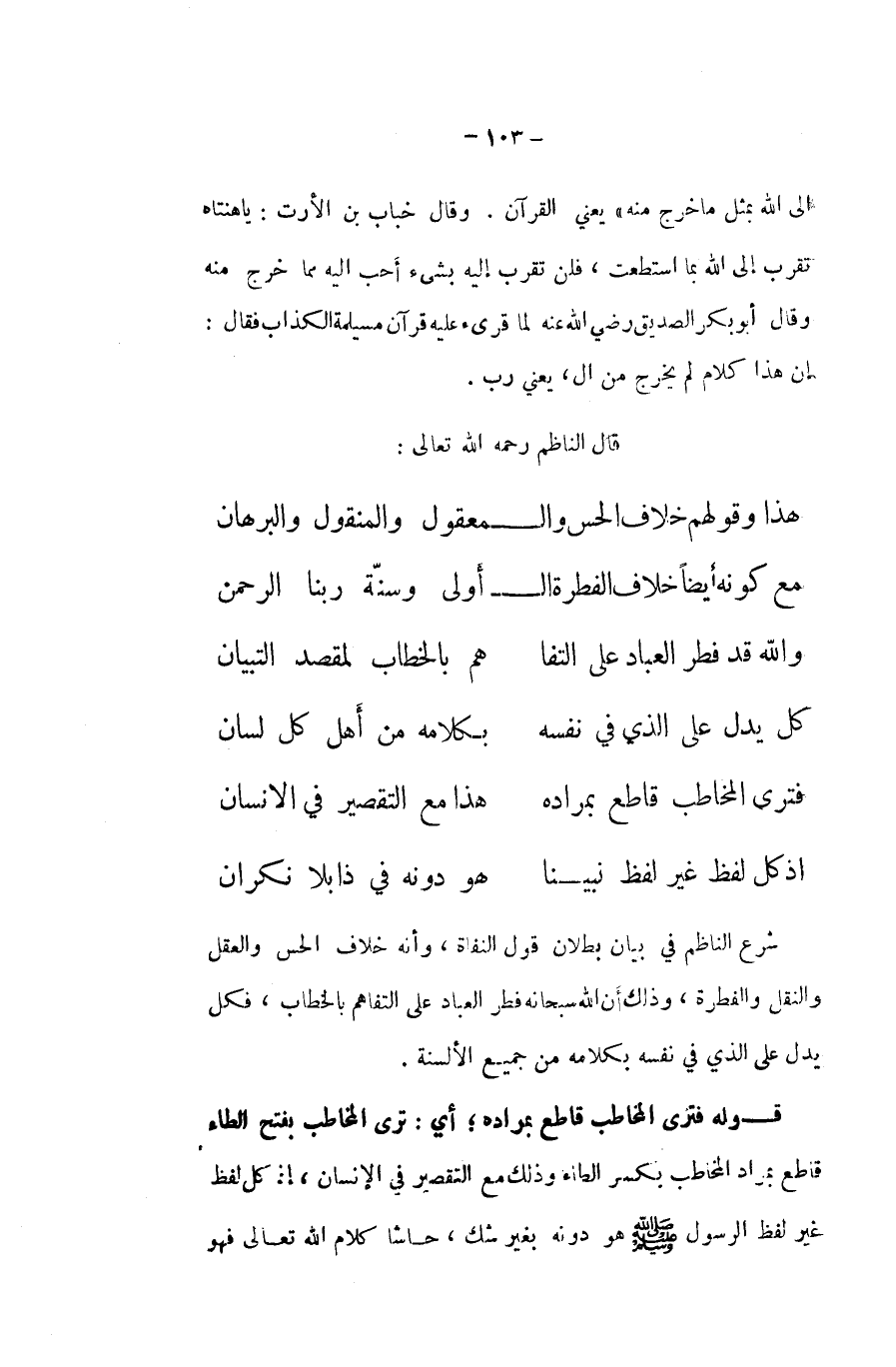 قَالَ النَّاظِم رَحمَه الله تَعَالَى ... هَذَا وَقَوْلهمْ خلاف الْحسن والمعقول وَالْمَنْقُول والبرهان ... مَعَ كَونه أَيْضا خلاف الْفطْرَة ال أولى وَسنة رَبنَا الرَّحْمَن