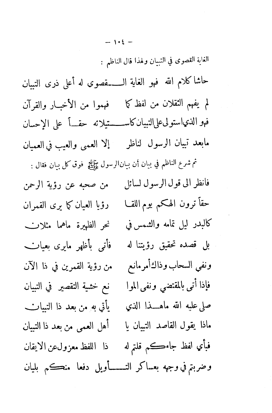 ثمَّ شرع النَّاظِم فِي بَيَان أَن بَيَان الرَّسُول صلى الله عَلَيْهِ وَسلم فَوق كل بَيَان فَقَالَ ... فَانْظُر الى قَول الرَّسُول لسائل ... من صَحبه عَن رُؤْيَة الرَّحْمَن ... حَقًا ترَوْنَ الهكم يَوْم اللقا ... رُؤْيا العيان كَمَا يرى القمران