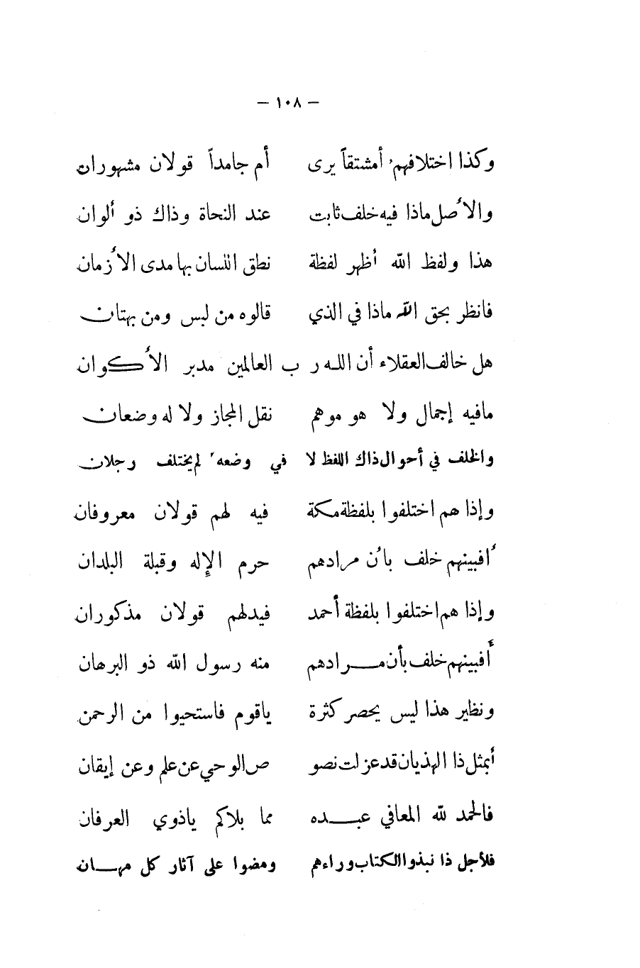وَإِذا هم اخْتلفُوا بِلَفْظَة مَكَّة ... فِيهِ لَهُم قَولَانِ معروفان ... أفبينهم خلف بَان مُرَادهم ... حرم الْإِلَه وقبلة الْبلدَانِ ... وَإِذا هم اخْتلفُوا بِلَفْظَة أَحْمد ... فيدلهم قَولَانِ مذكوران