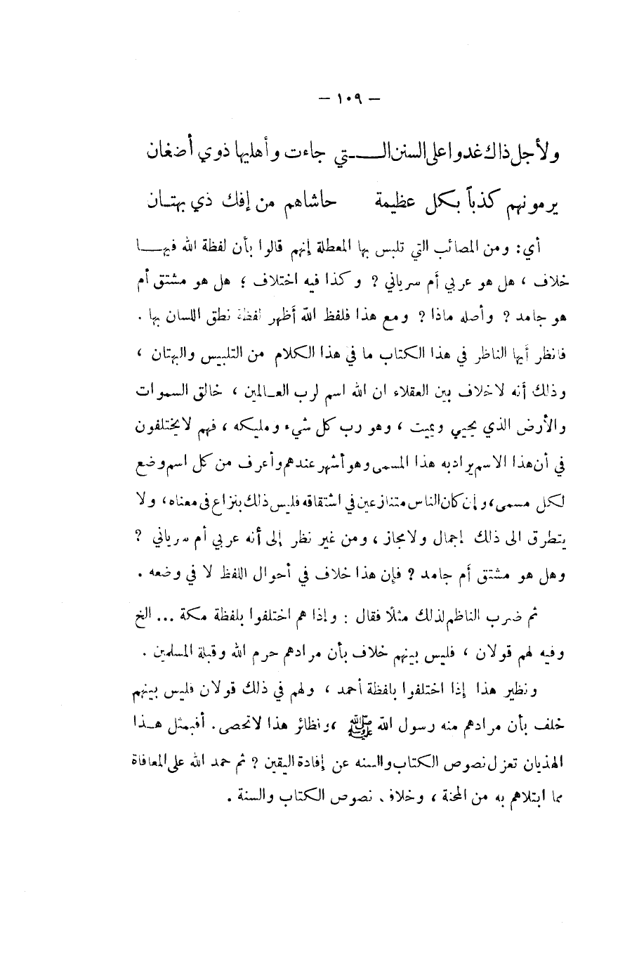 أَي وَمن المصائب الَّتِي تلبس بهَا المعطلة إِنَّهُم قَالُوا بِأَن لَفْظَة الله فِيهَا خلاف هَل هُوَ عَرَبِيّ ام سرياني وَكَذَا فِيهِ اخْتِلَاف هَل هُوَ مُشْتَقّ ام هُوَ جامد وَأَصله مَاذَا وَمَعَ هَذَا فَلفظ الله أظهر لَفْظَة نطق اللِّسَان بهَا فَانْظُر أَيهَا النَّاظر فِي هَذَا الْكتاب مَا فِي هَذَا الْكَلَام من التلبيس والبهتان وَذَلِكَ أَنه لَا خلاف بَين الْعُقَلَاء ان الله اسْم لرب الْعَالمين خَالق السَّمَاوَات وَالْأَرْض الَّذِي يحيي وَيُمِيت وَهُوَ رب كل شَيْء ومليكه فهم لَا يَخْتَلِفُونَ فِي ان هَذَا الِاسْم يُرَاد بِهِ هَذَا الْمُسَمّى وَهُوَ أشهر عِنْدهم وَأعرف من كل اسْم وضع لكل مُسَمّى وَإِن كَانَ النَّاس متنازعين فِي اشتقاقه فَلَيْسَ ذَلِك بنزاع فِي مَعْنَاهُ وَلَا يتَطَرَّق الى ذَلِك إِجْمَال وَلَا مجَاز وَمن غير نظر إِلَى أَنه عَرَبِيّ ام سرياني وَهل هُوَ مُشْتَقّ ام جامد فَإِن هَذَا خلاف فِي أَحْوَال اللَّفْظ لَا فِي وَضعه