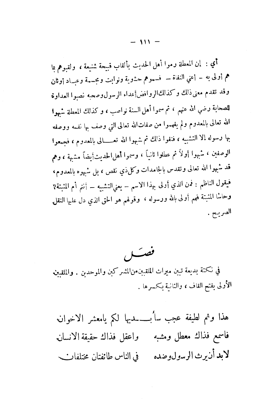 أَي إِن المعطلة رموا أهل الحَدِيث بألقاب قبيحة شنيعة ولقبوهم بِمَا هم أولى بِهِ أَعنِي النفاة فسموهم حشوية ونوابت ومجسمة وَعباد اوثان وَقد تقدم معنى ذَلِك وكذاك الروافض أَعدَاء الرَّسُول وَصَحبه نصبوا الْعَدَاوَة للصحابة رَضِي الله عَنْهُم ثمَّ سموا أهل السّنة نواصب وَكَذَلِكَ المعطلة شبهوا الله تَعَالَى بالمعدوم وَلم يفهموا من صِفَات من صِفَات الله تَعَالَى الَّتِي وصف بهَا نَفسه وَوَصفه بهَا رَسُوله إِلَّا التَّشْبِيه فنفوا من صِفَات الله تَعَالَى بالمعدوم فَجمعُوا الوصفين شبهوا أَولا عطلوا ثَانِيًا وَسموا أهل الحَدِيث ايضا مشبهة وهم قد شبهوا الله تَعَالَى وتقدس بالجامدات وكل ذِي نقص بل شبهوه بالمعدوم فَيَقُول النَّاظِم فَمن الَّذِي أولى بِهَذَا الِاسْم يَعْنِي التَّشْبِيه أَنْتُم ام المثبتة وحاشا المثبتة فهم أولى بِاللَّه وَرَسُوله وَقَوْلهمْ هُوَ الْحق الَّذِي دلّ عَلَيْهَا النَّقْل الصَّرِيح
