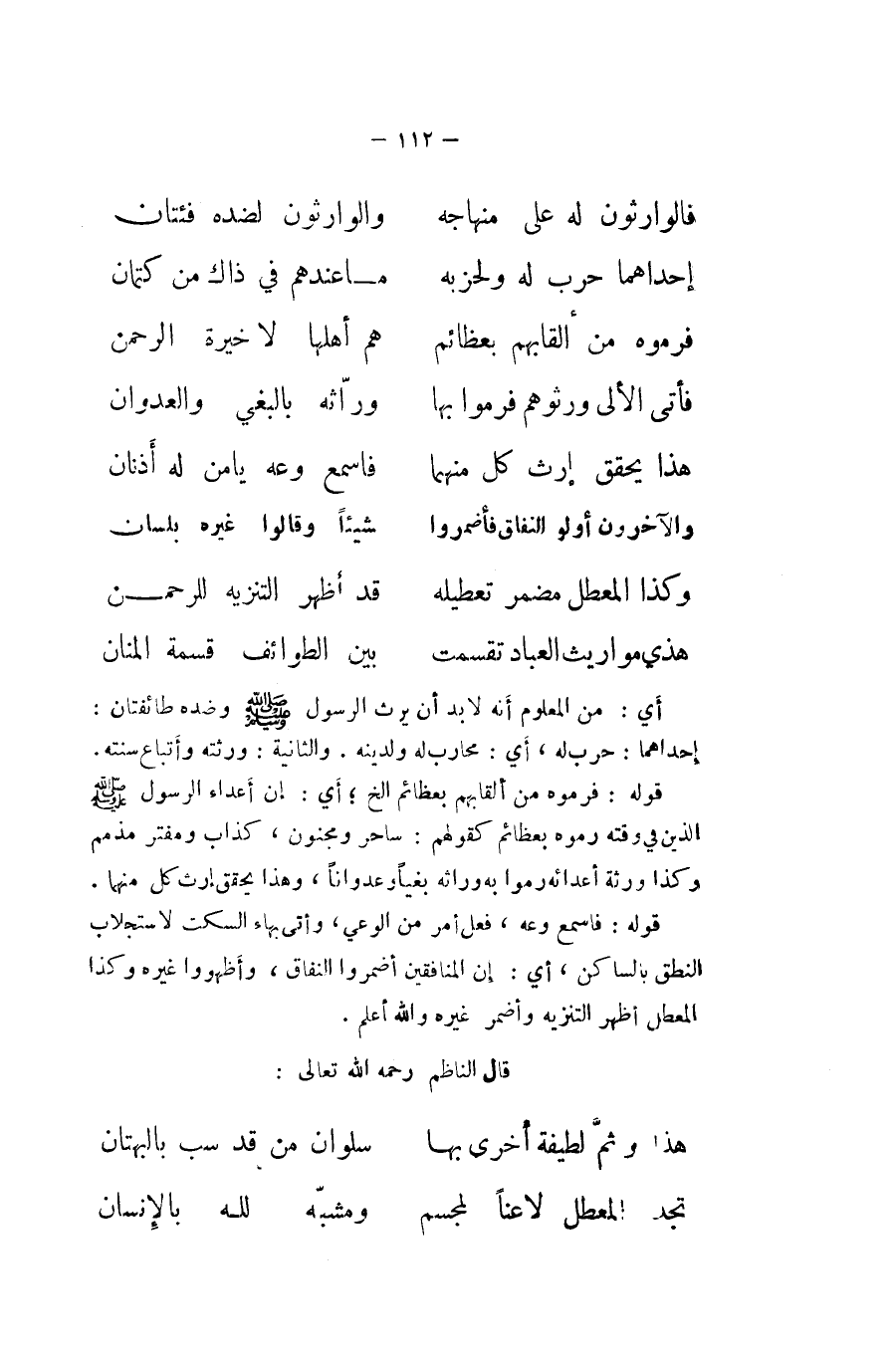 .. فالوارثون لَهُ على منهاجه ... والوارثون لضده فئتان ... إِحْدَاهمَا حَرْب لَهُ ولحزبه ... مَا عِنْدهم فِي ذَاك من كتمان ... فَرَمَوْهُ من ألقابهم بعظائم ... هم أَهلهَا لَا خيرة الرَّحْمَن