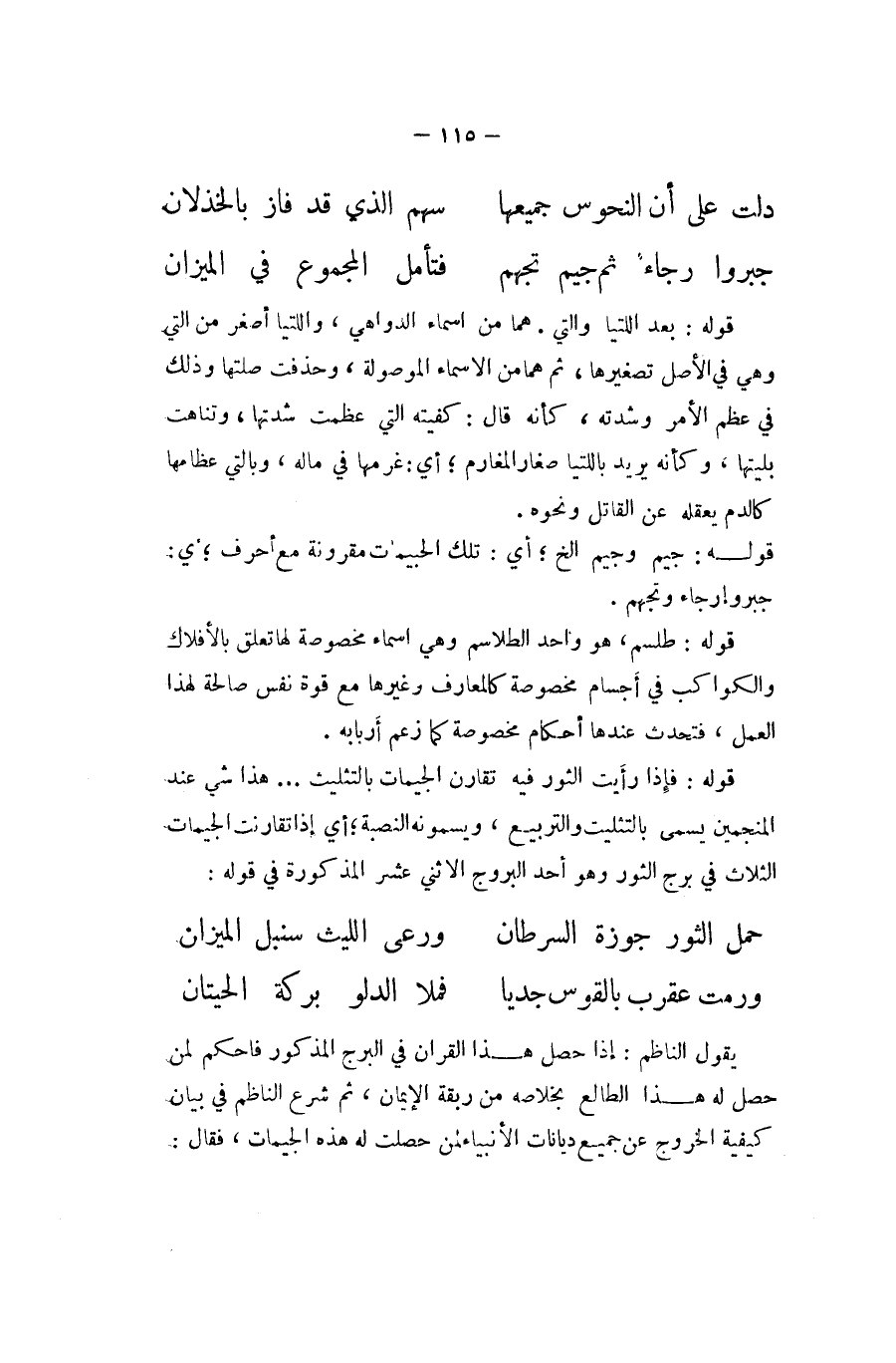 .. دلّت على ان النحوس جَمِيعهَا ... سهم الَّذِي قد فَازَ بالخذلان ... جبروا رَجَاء ثمَّ جِيم ... تجهم فَتَأمل الْمَجْمُوع فِي الْمِيزَان ...