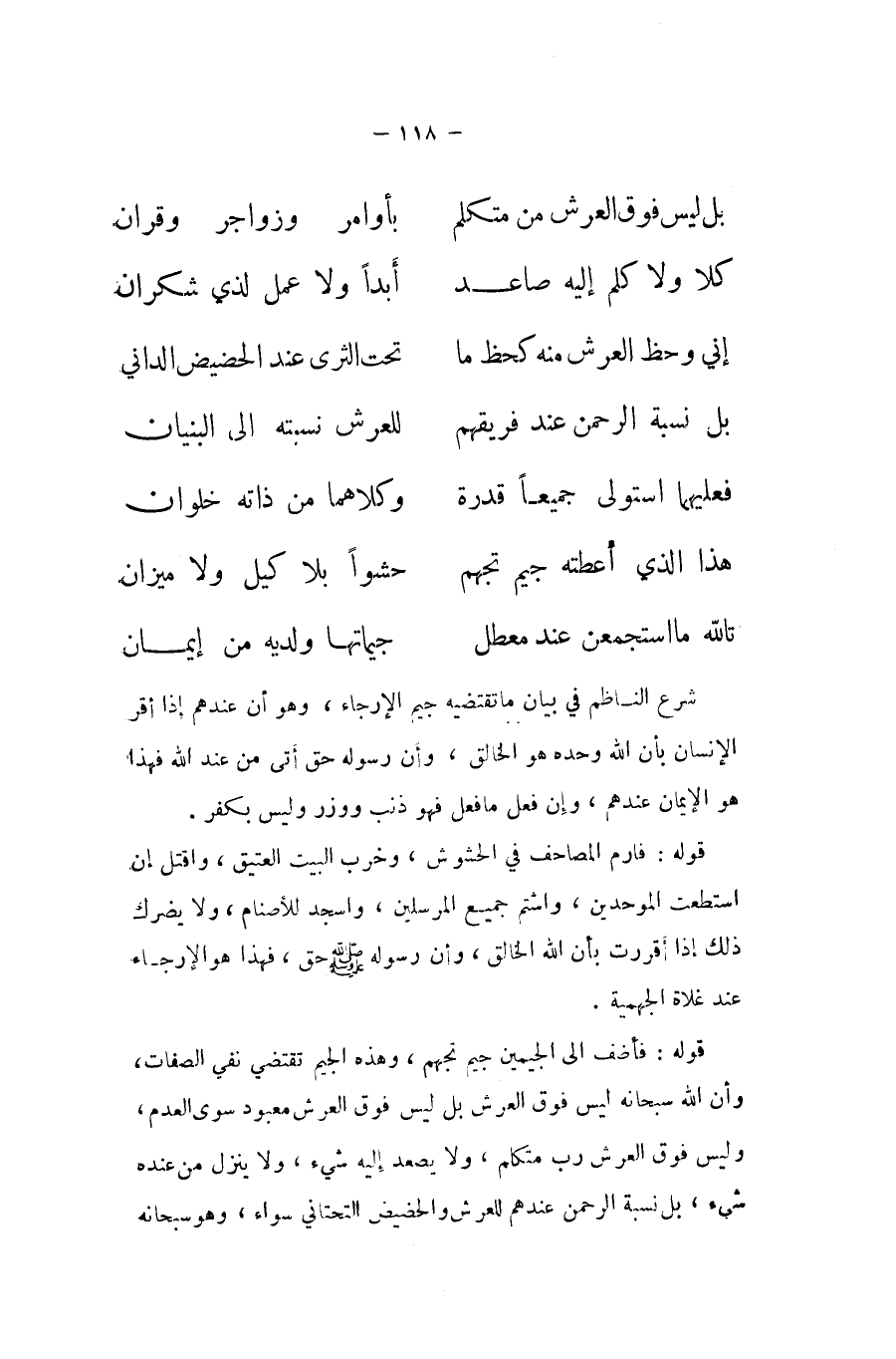 قَوْله فأضف الى الجيمين جِيم تجهم وَهَذِه الْجِيم تَقْتَضِي نفي الصِّفَات وان الله سُبْحَانَهُ لَيْسَ فَوق الْعَرْش بل لَيْسَ فَوق الْعَرْش معبود سوى الْعَدَم وَلَيْسَ فَوق الْعَرْش رب مُتَكَلم وَلَا يصعد إِلَيْهِ شَيْء وَلَا ينزل من عِنْده شَيْء بل نِسْبَة الرَّحْمَن عِنْدهم للعرش والحضيض التحتاني سَوَاء وَهُوَ سُبْحَانَهُ