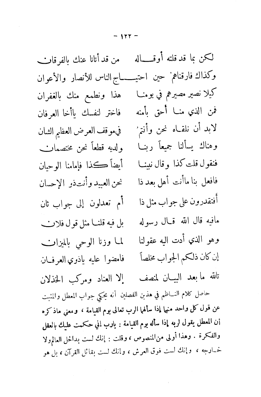 وَهُوَ الَّذِي أدَّت إِلَيْهِ عقولنا لما وزنا الْوَحْي بالميزان ... إِن كَانَ ذَلِكُم الْجَواب مخلصا ... فامضوا عَلَيْهِ يَا ذَوي الْعرْفَان
