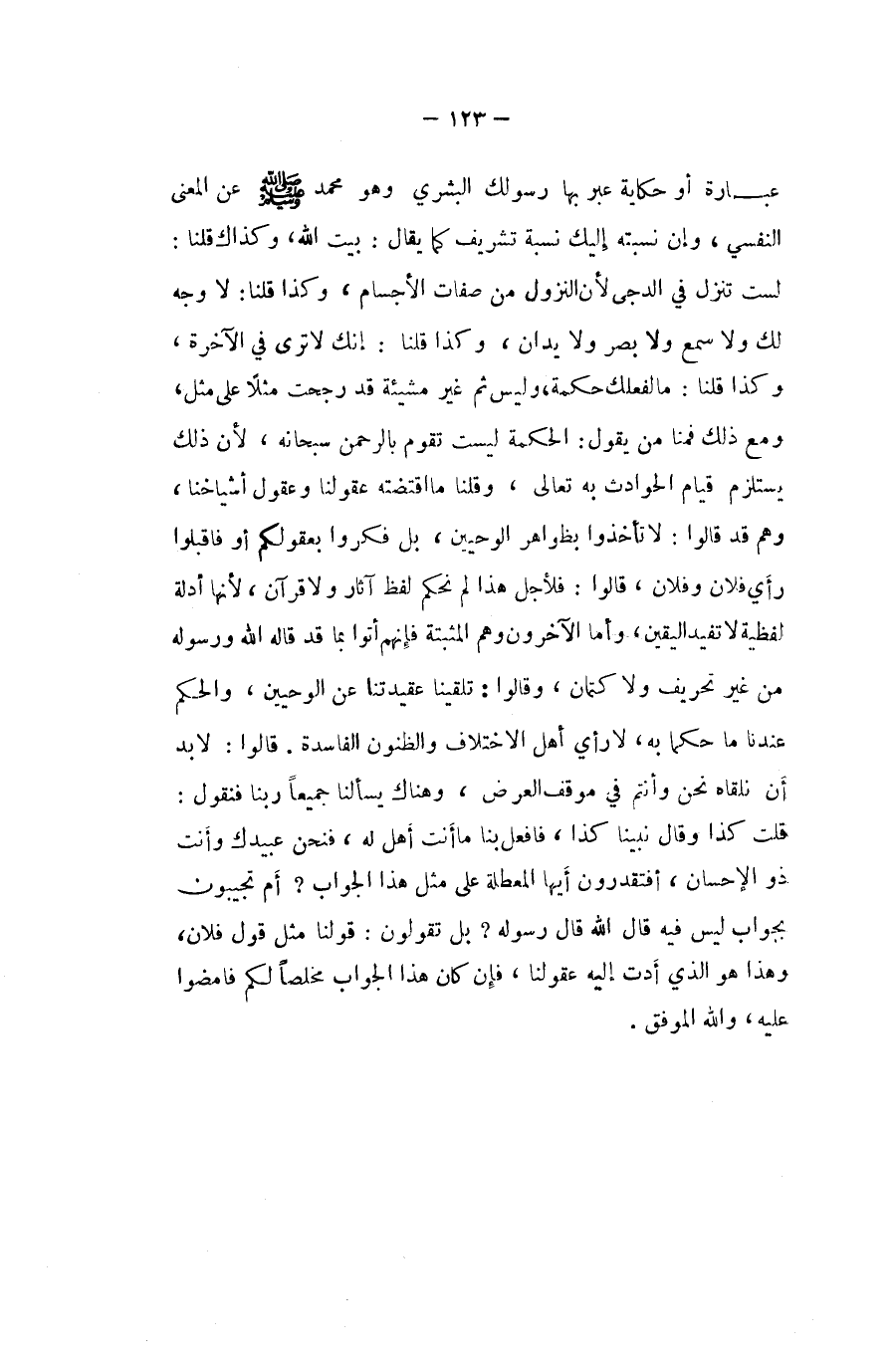 عبارَة أَو حِكَايَة عبر بهَا رَسُولك البشري وَهُوَ مُحَمَّد صلى الله عَلَيْهِ وَسلم عَن الْمَعْنى النَّفْسِيّ وَإِن نسبته إِلَيْك نِسْبَة شريفة كَمَا يُقَال بَيت الله وكذاك قُلْنَا لست تنزل فِي الدجى لِأَن النُّزُول من صِفَات الاجسام وَكَذَا قُلْنَا لَا وَجه لَك وَلَا سمع وَلَا بصر وَلَا يدان وَكَذَا قُلْنَا إِنَّك لَا ترى فِي الْآخِرَة وَكَذَا قُلْنَا مَا لفعلك حِكْمَة وَلَيْسَ ثمَّ غير مَشِيئَة قد رجحت مثلا على مثل وَمَعَ ذَلِك فمنا من يَقُول الْحِكْمَة لَيست تقوم بالرحمن سُبْحَانَهُ لِأَن ذَلِك يسْتَلْزم قيام الْحَوَادِث بِهِ تَعَالَى وَقُلْنَا مَا اقتضته عقولنا وعقول أشياخنا وهم قد قَالُوا لَا تَأْخُذُوا بظواهر الوحيين بل فَكروا بعقولكم أَو فاقبلوا رَأْي فلَان وَفُلَان قَالُوا فلأجل هَذَا لم نحكم لفظ آثَار وَلَا قُرْآن لِأَنَّهَا أَدِلَّة لفظية لَا تفِيد الْيَقِين وَأما الْآخرُونَ وهم المثبتة فَإِنَّهُم أَتَوا بِمَا قد قَالَه الله وَرَسُوله من غير تَحْرِيف وَلَا كتمان وَقَالُوا تلقينا عقيدتنا عَن الوحيين وَالْحكم عندنَا مَا حكما بِهِ لَا رَأْي أهل الِاخْتِلَاف والظنون الْفَاسِدَة قَالُوا لَا بُد أَن نَلْقَاهُ نَحن وَأَنْتُم فِي موقف الْعرض وَهُنَاكَ يسألنا جَمِيعًا رَبنَا فَنَقُول قلت كَذَا وَقَالَ نَبينَا كَذَا فافعل بِنَا مَا انت أهل لَهُ فَنحْن عبيدك وَأَنت ذُو الْإِحْسَان أفتقدرون أَيهَا المعطلة على مثل هَذَا الْجَواب أم تجيبون بِجَوَاب لَيْسَ فِيهِ قَالَ الله قَالَ رَسُوله بل تَقولُونَ قَوْلنَا مثل قَول فلَان وَهَذَا هُوَ الَّذِي أدَّت إِلَيْهِ عقولنا فَإِن كَانَ هَذَا الْجَواب مخلصا لكم فامضوا عَلَيْهِ وَالله الْمُوفق