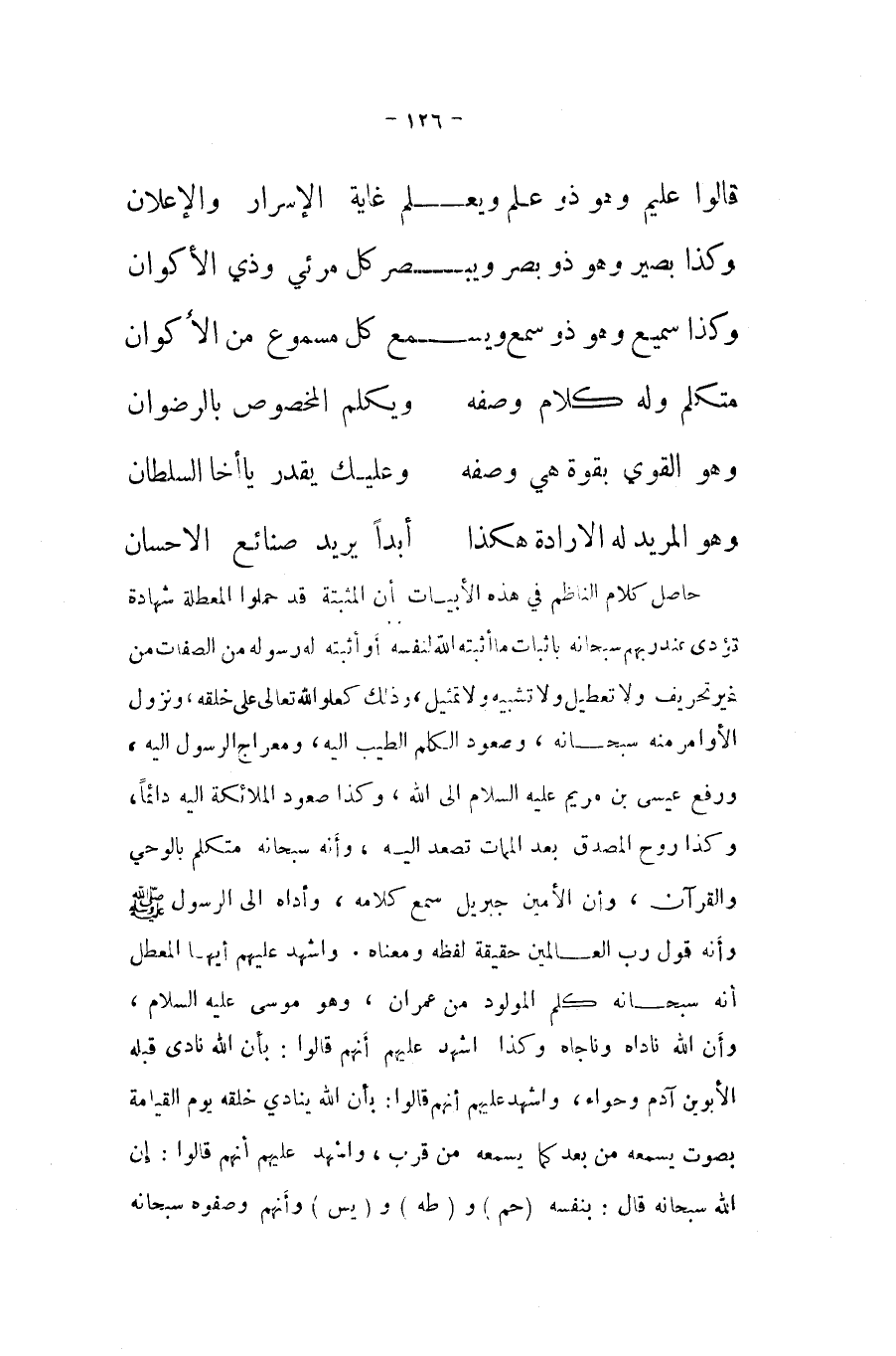 حَاصِل كَلَام النَّاظِم فِي هَذِه الأبيات ان المثبتة قد حملُوا المعطلة شَهَادَة تُؤدِّي عِنْد رَبهم سُبْحَانَهُ باثبات مَا أثْبته الله لنَفسِهِ أَو أثْبته لَهُ رَسُوله من الصِّفَات من غير تَحْرِيف وَلَا تَعْطِيل وَلَا تَشْبِيه وَلَا تَمْثِيل وَذَلِكَ كعلو الله تَعَالَى على خلقه ونزول الْأَوَامِر مِنْهُ سُبْحَانَهُ وصعود الْكَلم الطّيب اليه ومعراج الرَّسُول اليه وَرفع عِيسَى بن مَرْيَم عَلَيْهِ السَّلَام الى الله وَكَذَا صعُود الْمَلَائِكَة اليه دَائِما وَكَذَا روح الْمُصدق بعد الْمَمَات تصعد اليه وَأَنه سُبْحَانَهُ مُتَكَلم بِالْوَحْي وَالْقُرْآن وان الامين جِبْرِيل سمع كَلَامه وَأَدَّاهُ الى الرَّسُول صلى الله عَلَيْهِ وَسلم وَأَنه قَول رب الْعَالمين حَقِيقَة لَفظه وَمَعْنَاهُ واشهد عَلَيْهِم أَيهَا الْمُعَطل انه سُبْحَانَهُ كلم الْمَوْلُود من عمرَان وَهُوَ مُوسَى عَلَيْهِ السَّلَام وان الله ناداه وناجاه وَكَذَا اشْهَدْ عَلَيْهِم أَنهم قَالُوا بِأَن الله نَادَى قبله الْأَبَوَيْنِ آدم وحواء واشهد عَلَيْهِم انهم قَالُوا بِأَن الله يُنَادي خلقه يَوْم الْقِيَامَة بِصَوْت يسمعهُ من بعد كَمَا يسمعهُ من قرب واشهد عَلَيْهِم أَنهم قَالُوا إِن الله سُبْحَانَهُ قَالَ بِنَفسِهِ {حم} و {طه} و {يس} وانهم وصفوه سُبْحَانَهُ