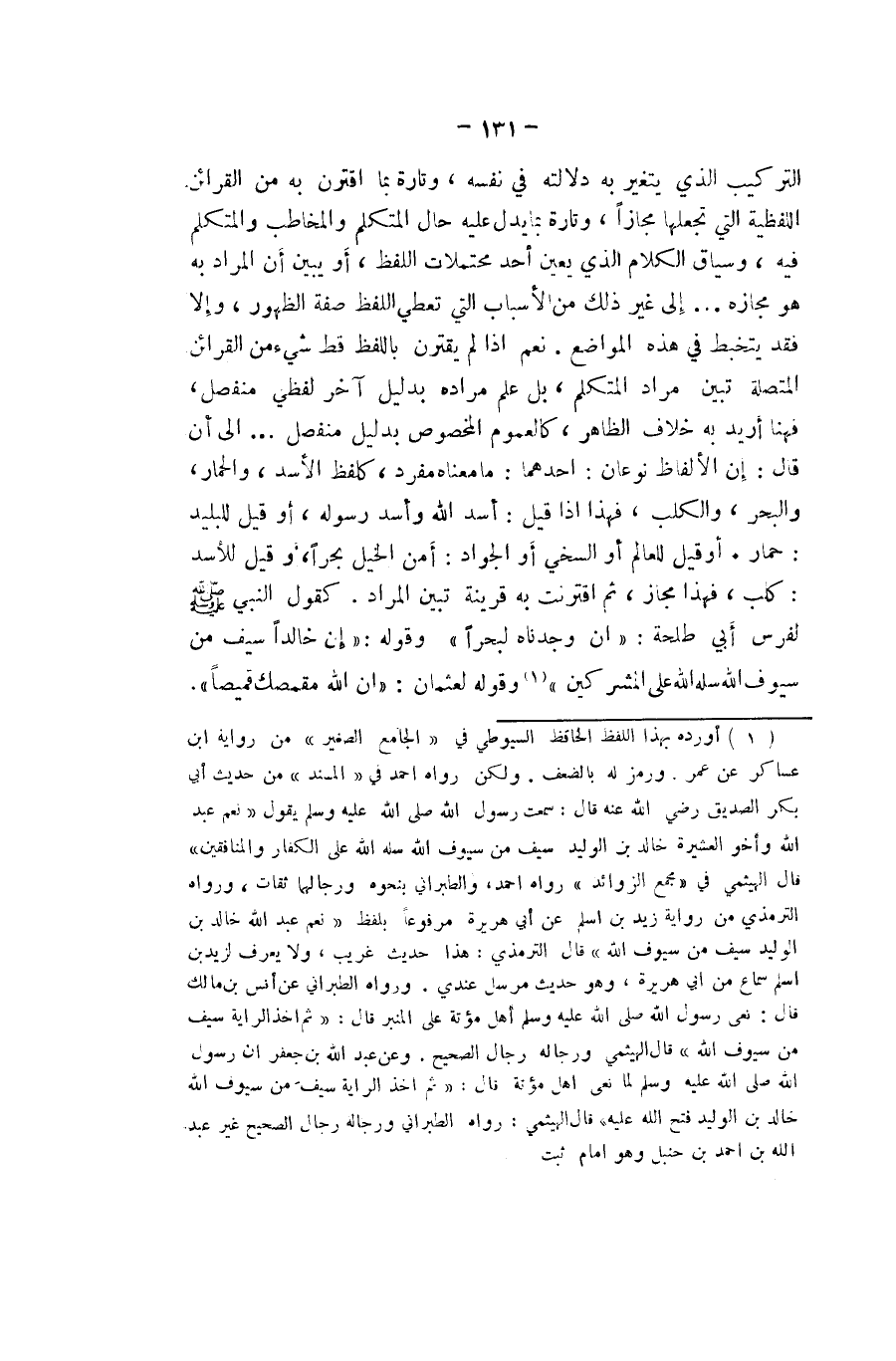 التَّرْكِيب الَّذِي يتَغَيَّر بِهِ دلَالَته فِي نَفسه وَتارَة بِمَا اقْترن بِهِ من الْقَرَائِن اللفظية الَّتِي تجعلها مجَازًا وَتارَة بِمَا يدل عَلَيْهِ حَال الْمُتَكَلّم والمخاطب والمتكلم فِيهِ وَسِيَاق الْكَلَام الَّذِي يعين اُحْدُ محتملات اللَّفْظ اَوْ يبين ان المُرَاد بِهِ هُوَ مجازه إِلَى غير ذَلِك من الْأَسْبَاب الَّتِي تُعْطِي اللَّفْظ صفة الظُّهُور وَإِلَّا فقد يتخبط فِي هَذِه الْمَوَاضِع نعم اذا لم يقْتَرن بِاللَّفْظِ قطّ شئ من الْقَرَائِن الْمُتَّصِلَة تبين مُرَاد الْمُتَكَلّم بل علم مُرَاده بِدَلِيل آخر لَفْظِي مُنْفَصِل فَهُنَا أُرِيد بِهِ خلاف الظَّاهِر كالعموم الْمَخْصُوص بِدَلِيل مُنْفَصِل الى ان قَالَ إِن الْأَلْفَاظ نَوْعَانِ احدهما مَا مَعْنَاهُ مُفْرد كَلَفْظِ الاسد وَالْحمار وَالْبَحْر وَالْكَلب فَهَذَا اذا قيل أَسد الله واسد رَسُوله أَو قيل للبليد حمَار اَوْ قيل للْعَالم اَوْ السخي اَوْ الْجواد امن الْخَيل بحرا وَقيل للاسد كلب فَهَذَا مجَاز ثمَّ اقترنت بِهِ قرينَة تبين المُرَاد كَقَوْل النَّبِي صلى الله عَلَيْهِ وَسلم لفرس ابي طَلْحَة ان وَجَدْنَاهُ لبحرا وَقَوله إِن خَالِدا سيف من سيوف الله سَله الله على الْمُشْركين وَقَوله لعُثْمَان ان الله مقمصك قَمِيصًا