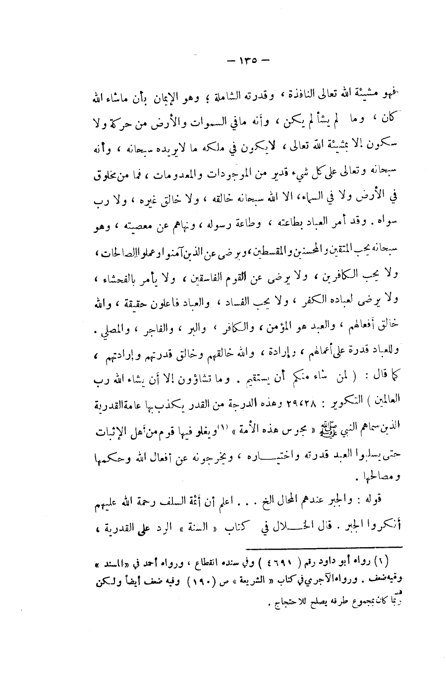 فَهُوَ مَشِيئَة الله تَعَالَى النافذة وَقدرته الشاملة وَهُوَ الْإِيمَان بِأَن مَا شَاءَ الله كَانَ وَمَا لم يَشَأْ لم يكن وَأَنه مَا فِي السَّمَاوَات وَالْأَرْض من حَرَكَة وَلَا سُكُون إِلَّا بِمَشِيئَة الله تَعَالَى لَا يكون فِي ملكه مَا لَا يُريدهُ سُبْحَانَهُ وَأَنه سُبْحَانَهُ وَتَعَالَى على كل شَيْء قدير من الموجودات والمعدومات فَمَا من مَخْلُوق فِي الأَرْض وَلَا فِي السَّمَاء الا الله سُبْحَانَهُ خالقه وَلَا خَالق غَيره وَلَا رب سواهُ وَقد امْر الْعباد بِطَاعَتِهِ وَطَاعَة رَسُوله ونهاهم عَن مَعْصِيَته وَهُوَ سُبْحَانَهُ يحب الْمُتَّقِينَ والمحسنين والمقسطين ويرضى عَن الَّذين آمنُوا وَعمِلُوا الصَّالِحَات وَلَا يحب الْكَافرين وَلَا يرضى عَن الْقَوْم الْفَاسِقين وَلَا يَأْمر بالفحشاء وَلَا يرضى لِعِبَادِهِ الْكفْر وَلَا يحب الْفساد والعباد فاعلون حَقِيقَة وَالله خَالق أفعالهم وَالْعَبْد هُوَ الْمُؤمن وَالْكَافِر وَالْبر والفاجر وَالْمُصَلي وللعباد قدرَة على أَعْمَالهم وَإِرَادَة وَالله خالقهم وخالق قدرتهم وإرادتهم كَمَا قَالَ {لمن شَاءَ مِنْكُم أَن يَسْتَقِيم وَمَا تشاؤون إِلَّا أَن يَشَاء الله رب الْعَالمين} التكوير وَهَذِه الدرجَة من الْقدر يكذب بهَا عَامَّة الْقَدَرِيَّة الَّذين سماهم النَّبِي صلى الله عَلَيْهِ وَسلم مجوس هَذِه الْأمة ويغلو فِيهَا قوم من أهل الْإِثْبَات حَتَّى يسلبوا العَبْد قدرته واختياره ويخرجونه عَن افعال الله وَحكمهَا ومصالحها