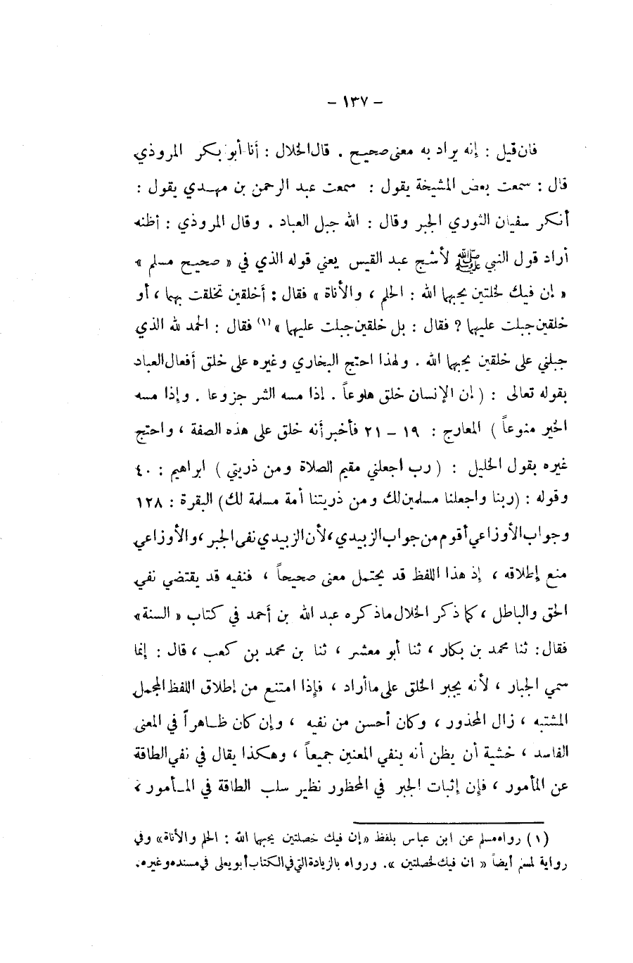 فان قيل إِنَّه يُرَاد بِهِ معنى صَحِيح قَالَ الْخلال انا ابو بكر الْمَرْوذِيّ قَالَ سَمِعت بعض المشيخة يَقُول سَمِعت عبد الرَّحْمَن بن مهْدي يَقُول أنكر سُفْيَان الثَّوْريّ الْجَبْر وَقَالَ الله جبل الْعباد وَقَالَ الْمَرْوذِيّ أَظُنهُ أَرَادَ قَول النَّبِي صلى الله عَلَيْهِ وَسلم لأشج عبد الْقَيْس يَعْنِي قَوْله الَّذِي فِي صَحِيح مُسلم إِن فِيك لخلتين يحبهما الله الْحلم والأناة فَقَالَ أخلقين تخلقت بهما اَوْ خلقين جبلت عَلَيْهِمَا فَقَالَ بل خلقين جبلت عَلَيْهِمَا فَقَالَ الْحَمد لله الَّذِي جبلني على خلقين يحبهما الله وَلِهَذَا احْتج البُخَارِيّ وَغَيره على خلق افعال الْعباد بقوله تَعَالَى {إِن الْإِنْسَان خلق هلوعا إِذا مَسّه الشَّرّ جزوعا وَإِذا مَسّه الْخَيْر منوعا} المعارج فَأخْبر أَنه خلق على هَذِه الصّفة وَاحْتج غَيره بقول الْخَلِيل {رب اجْعَلنِي مُقيم الصَّلَاة وَمن ذريتي} ابراهيم وَقَوله {رَبنَا واجعلنا مُسلمين لَك وَمن ذريتنا أمة مسلمة لَك} الْبَقَرَة وَجَوَاب الْأَوْزَاعِيّ أقوم من جَوَاب الزبيدِيّ لِأَن الزبيدِيّ نفى الْجَبْر وَالْأَوْزَاعِيّ منع إِطْلَاقه إِذْ هَذَا اللَّفْظ قد يحْتَمل معنى صَحِيحا فنفيه قد يَقْتَضِي نفي الْحق وَالْبَاطِل كَمَا ذكر الْخلال مَا ذكره عبد الله بن احْمَد فِي كتاب السّنة فَقَالَ ثَنَا مُحَمَّد بن بكار ثَنَا ابو معشر ثَنَا بن مُحَمَّد بن كَعْب قَالَ إِنَّمَا سمي الْجَبَّار لِأَنَّهُ يجْبر الْخلق على مَا أورد فَإِذا امْتنع من إِطْلَاق اللَّفْظ الْمُجْمل المشتبه زَالَ الْمَحْذُور وَكَانَ احسن من نَفْيه وَإِن كَانَ ظَاهرا فِي الْمَعْنى الْفَاسِد خشيَة ان يظنّ أَنه ينفى المعنين جَمِيعًا وَهَكَذَا يُقَال فِي نفي الطَّاقَة عَن الْمَأْمُور فَإِن إِثْبَات الْجَبْر فِي الْمَحْظُور نَظِير سلب الطَّاقَة فِي الْمَأْمُور