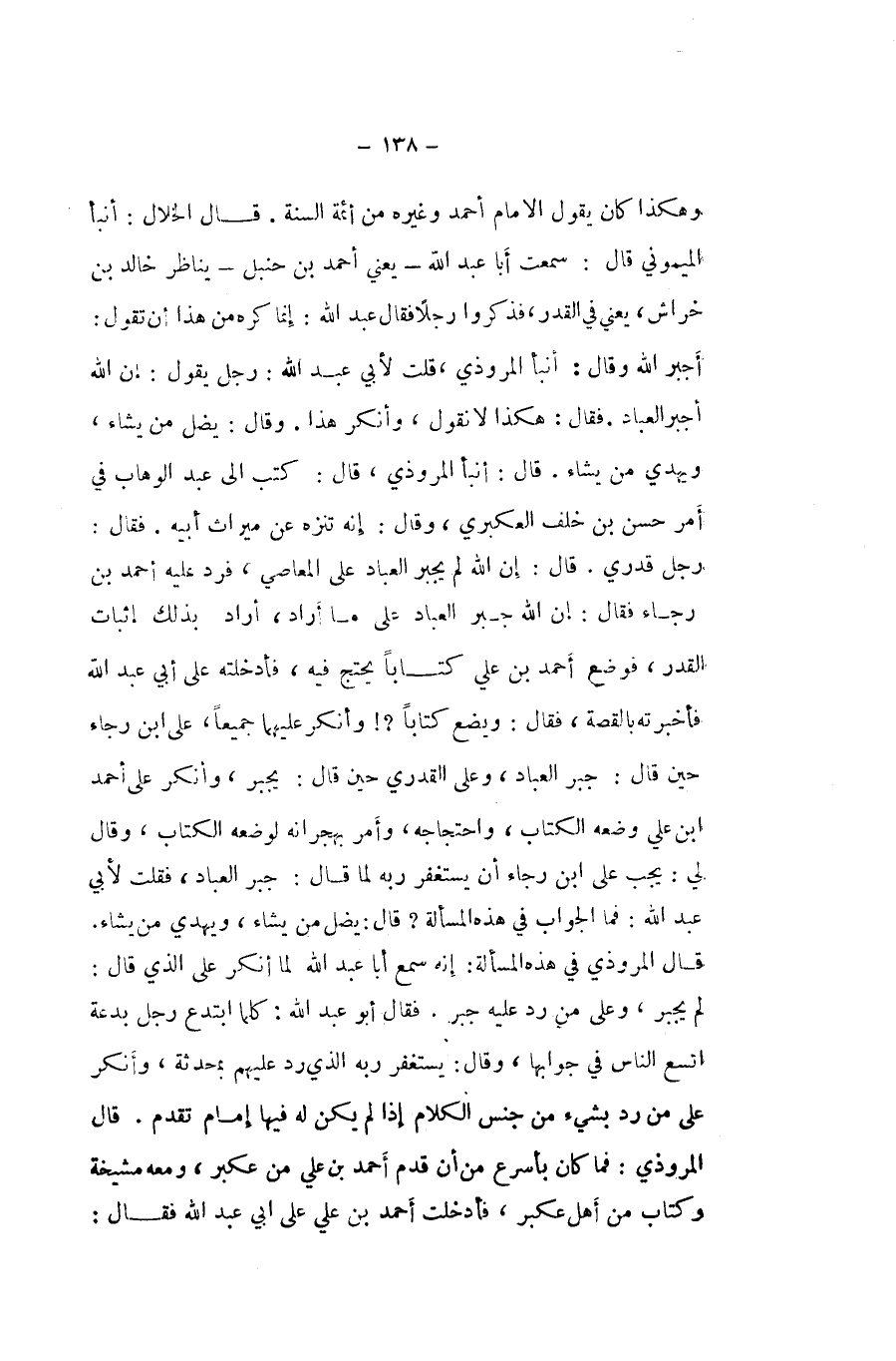 وَهَكَذَا كَانَ يَقُول الامام احْمَد وَغَيره من ائمة السّنة قَالَ الْخلال أنبا الْمَيْمُونِيّ قَالَ سَمِعت ابا عبد الله يَعْنِي احْمَد بن حَنْبَل يناظر خَالِد بن خرَاش يَعْنِي فِي الْقدر فَذكرُوا رجلا فَقَالَ عبد الله إِنَّمَا كره من هَذَا ان تَقول أجبر الله وَقَالَ أنبأ الْمَرْوذِيّ قلت لأبي عبد الله رجل يَقُول إِن الله أجبر الْعباد فَقَالَ هَكَذَا لَا نقُول وَأنكر هَذَا وَقَالَ يضل من يَشَاء وَيهْدِي من يَشَاء قَالَ أنبأ الْمَرْوذِيّ قَالَ كتب الى عبد الْوَهَّاب فِي امْر حسن بن خلف العكبري وَقَالَ إِنَّه تنزه عَن مِيرَاث أَبِيه فَقَالَ رجل قدري قَالَ إِن الله لم يجْبر الْعباد على الْمعاصِي فَرد عَلَيْهِ احْمَد بن رَجَاء فَقَالَ إِن الله جبر الْعباد على مَا أَرَادَ اراد بذلك إِثْبَات الْقدر فَوضع احْمَد بن عَليّ كتابا يحْتَج فِيهِ فأدخلته على أبي عبد الله فَأَخْبَرته بالقصة فَقَالَ وَيَضَع كتابا وَأنكر عَلَيْهِمَا جَمِيعًا على ابْن رَجَاء حِين قَالَ جبر الْعباد وعَلى القدري حِين قَالَ يجْبر وانكر على أَحْمد ابْن عَليّ وَضعه الْكتاب واحتجاجه وَأمر بهجرانه لوضعه الْكتاب وَقَالَ لي يجب على ابْن رَجَاء ان يسْتَغْفر ربه لما قَالَ جبر الْعباد فَقلت لأبي عبد الله فَمَا الْجَواب فِي هَذِه الْمَسْأَلَة قَالَ يضل من يَشَاء وَيهْدِي من يَشَاء قَالَ الْمَرْوذِيّ فِي هَذِه الْمَسْأَلَة إِنَّه سمع أَبَا عبد الله لما أنكر على الَّذِي قَالَ لم يجْبر وعَلى من رد عَلَيْهِ جبر فَقَالَ أَبُو عبد الله كلما ابتدع رجل بِدعَة اتَّسع النَّاس فِي جوابها وَقَالَ يسْتَغْفر ربه الَّذِي رد عَلَيْهِم بمحدثة وَأنكر على من رد بِشَيْء من جنس الْكَلَام إِذا لم يكن لَهُ فِيهَا إِمَام تقدم قَالَ الْمَرْوذِيّ فَمَا كَانَ بأسرع من ان قدم احْمَد بن عَليّ عَن عكبر وَمَعَهُ مشيخة وَكتاب من اهل عكبر فأدخلت أَحْمد بن عَليّ على ابي عبد الله فَقَالَ