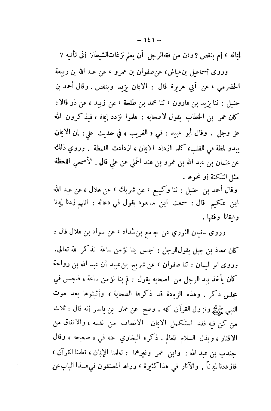 وروى سُفْيَان الثَّوْريّ عَن جَامع بن شَدَّاد عَن سَواد بن هِلَال قَالَ كَانَ معَاذ بن جبل يَقُول للرجل اجْلِسْ بِنَا نؤمن سَاعَة نذْكر الله تَعَالَى وروى ابو الْيَمَان ثَنَا صَفْوَان عَن شُرَيْح بن عبيد ان عبد الله بن رَوَاحَة كَانَ يَأْخُذ بيد الرجل من اصحابه يَقُول قُم بِنَا نؤمن سَاعَة فنجلس فِي مجْلِس ذكر وَهَذِه الزِّيَادَة قد ذكرهَا الصَّحَابَة واثبتوها بعد موت النَّبِي صلى الله عَلَيْهِ وَسلم ونزول الْقُرْآن كُله وَصَحَّ عَن عمار بن يَاسر أَنه قَالَ ثَلَاث من كن فِيهِ فقد اسْتكْمل الايمان الانصاف من نَفسه والانفاق من الاقتار وبذل السَّلَام للْعَالم ذكره البُخَارِيّ عَنهُ فِي صَحِيحه وَقَالَ جُنْدُب بن عبد الله وَابْن عمر وَغَيرهمَا تعلمنا الْإِيمَان تعلمنا الْقُرْآن فازددنا إِيمَانًا والْآثَار فِي هَذَا كَثِيرَة رَوَاهَا المصنفون فِي هَذَا الْبَاب عَن
