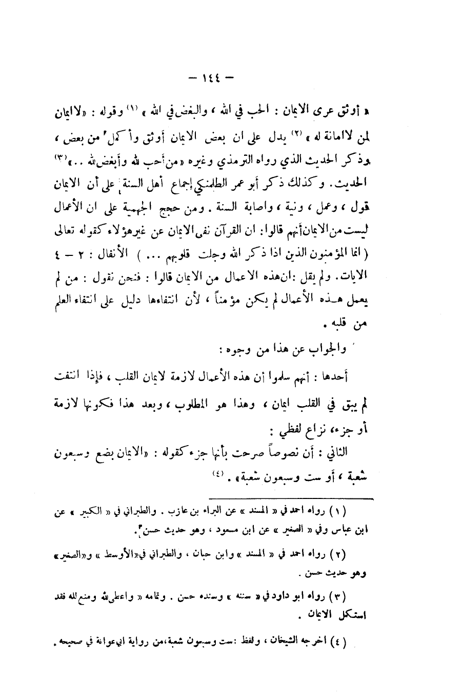 أوثق عرى الايمان الْحبّ فِي الله والبغض فِي الله وَقَوله لاايمان لمن لَا امانة لَهُ يدل على ان بعض الايمان أوثق وأكمل من بعض وَذكر الحَدِيث الَّذِي رَوَاهُ التِّرْمِذِيّ وَغَيره من أحب لله وَأبْغض لله الحَدِيث وَكَذَلِكَ ذكر لأبو عمر الطلمنكي إِجْمَاع أهل السّنة على أَن الايمان قَول وَعمل وَنِيَّة واصابة السّنة وَمن حجج الْجَهْمِية على أَن الْأَعْمَال لَيست من الْأَيْمَان أَنهم قَالُوا ان الْقرَان نفى الايمان عَن غير هَؤُلَاءِ كَقَوْلِه تَعَالَى {إِنَّمَا الْمُؤْمِنُونَ الَّذين إِذا ذكر الله وجلت قُلُوبهم} الْأَنْفَال الايات وَلم يقل ان هَذِه الْأَعْمَال من الْإِيمَان قَالُوا فَنحْن نقُول من لم يعْمل هَذِه الْأَعْمَال لم يكن مُؤمنا لِأَن انتفاءها دَلِيل على انْتِفَاء الْعلم من قلبه
