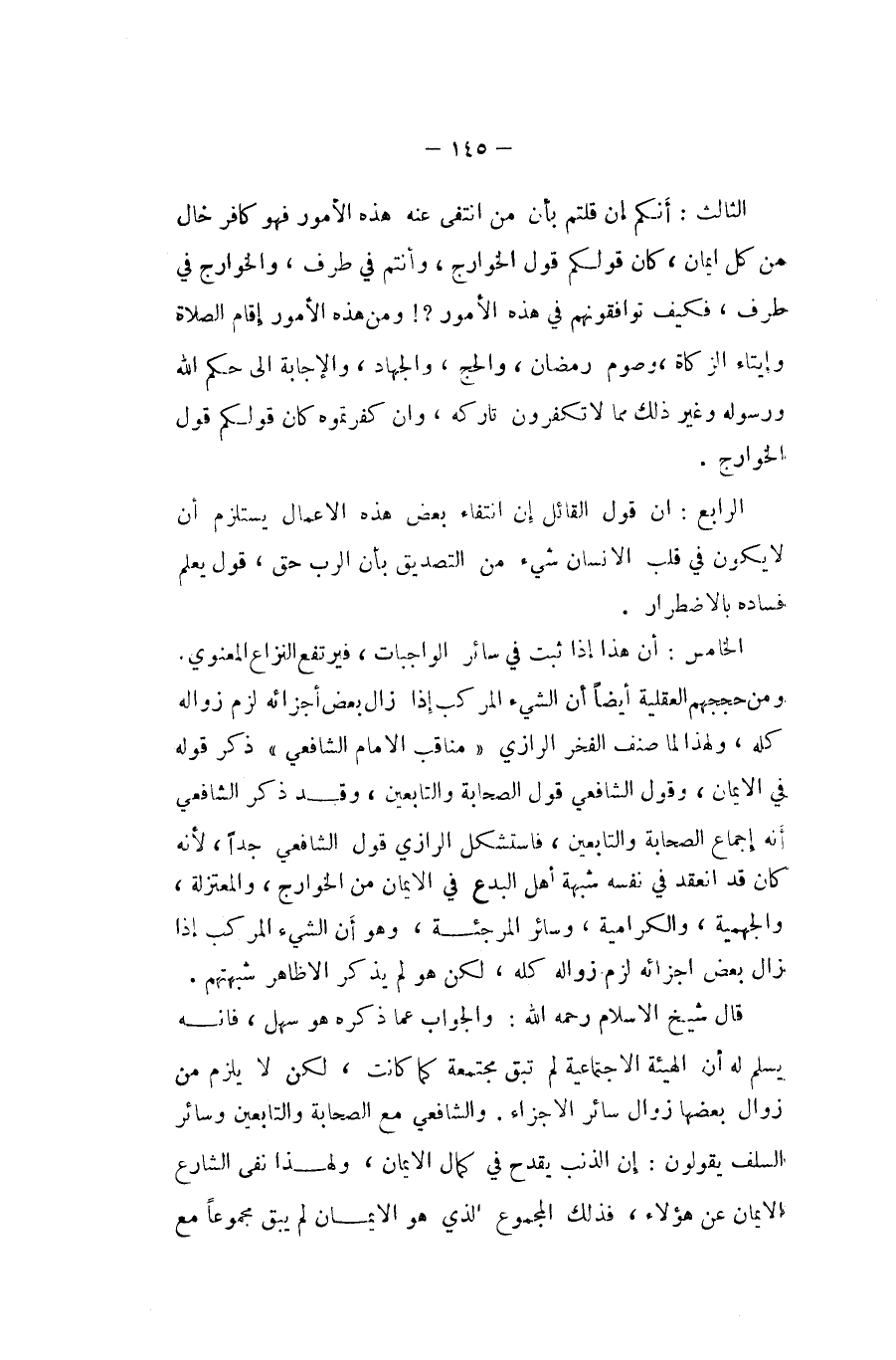 الْخَامِس أَن هَذَا إِذا ثَبت فِي سَائِر الْوَاجِبَات فيرتفع النزاع الْمَعْنَوِيّ وَمن حججهم الْعَقْلِيَّة أَيْضا أَن الشَّيْء الْمركب إِذا زَالَ بعض أَجْزَائِهِ لزم زَوَاله كُله وَلِهَذَا لما صنف الْفَخر الرَّازِيّ مَنَاقِب الإِمَام الشَّافِعِي ذكر قَوْله فِي الايمان وَقَول الشَّافِعِي قَول الصَّحَابَة وَالتَّابِعِينَ وَقد ذكر الشَّافِعِي أَنه احماع الصَّحَابَة وَالتَّابِعِينَ فاستشكل الرَّازِيّ قَول الشَّافِعِي جدا لِأَنَّهُ كَانَ قد انْعَقَد فِي نَفسه شُبْهَة أهل الْبدع فِي الايمان من الْخَوَارِج والمعتزلة والجهمية والكرامية وَسَائِر المرجئة وَهُوَ أَن الشَّيْء الْمركب إِذا زَالَ بعض أَجْزَائِهِ لزم زَوَاله كُله لَكِن هُوَ لم يذكر الا ظَاهر شبهتهم