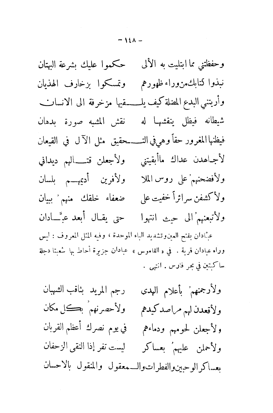 .. وحفظتني مِمَّا ابْتليت بِهِ الألى ... حكمُوا عَلَيْك بشرعة الْبُهْتَان ... نبذوا كتابك من وَرَاء ظُهُورهمْ ... وتمسكوا بزخارف الهذيان