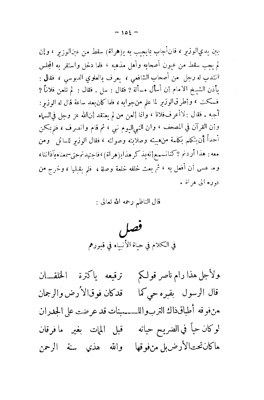 ... وَلأَجل هَذَا رام نَاصِر قَوْلكُم ... ترقيعه يَا كَثْرَة الخلقان ... قَالَ الرَّسُول بقبره حَيّ كَمَا ... قد كَانَ فَوق الارض والرجمان