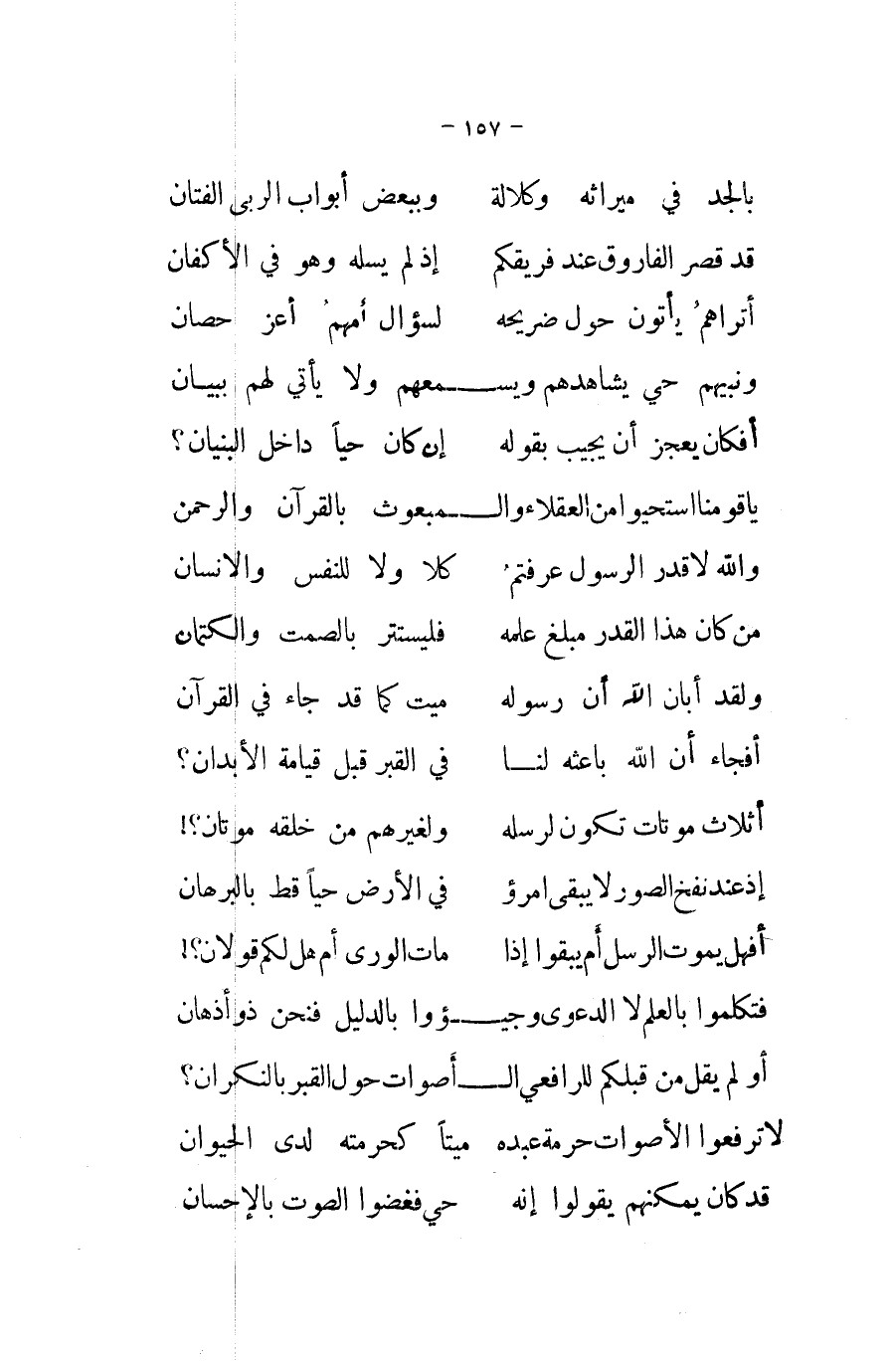 يَا قَومنَا اسْتَحْيوا من الْعُقَلَاء والمبعوث بِالْقُرْآنِ والرحمن ... وَالله لَا قدر الرَّسُول عَرَفْتُمْ ... كلا وَلَا للنَّفس والانسان ... من كَانَ هَذَا الْقدر مبلغ علمه ... فليستتر بِالصَّمْتِ والكتمان
