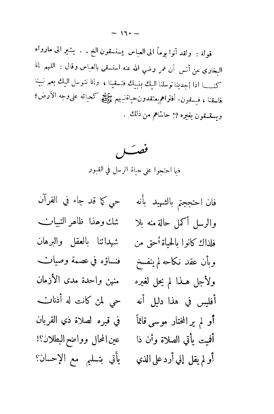 ... فان احتججتم بالشهيد بِأَنَّهُ ... حَيّ كَمَا قد جَاءَ فِي الْقُرْآن ... وَالرسل أكمل حَالَة مِنْهُ بِلَا ... شكّ وَهَذَا ظَاهر التِّبْيَان ... فلذاك كَانُوا بِالْحَيَاةِ أَحَق من ... شهدائنا بِالْعقلِ والبرهان