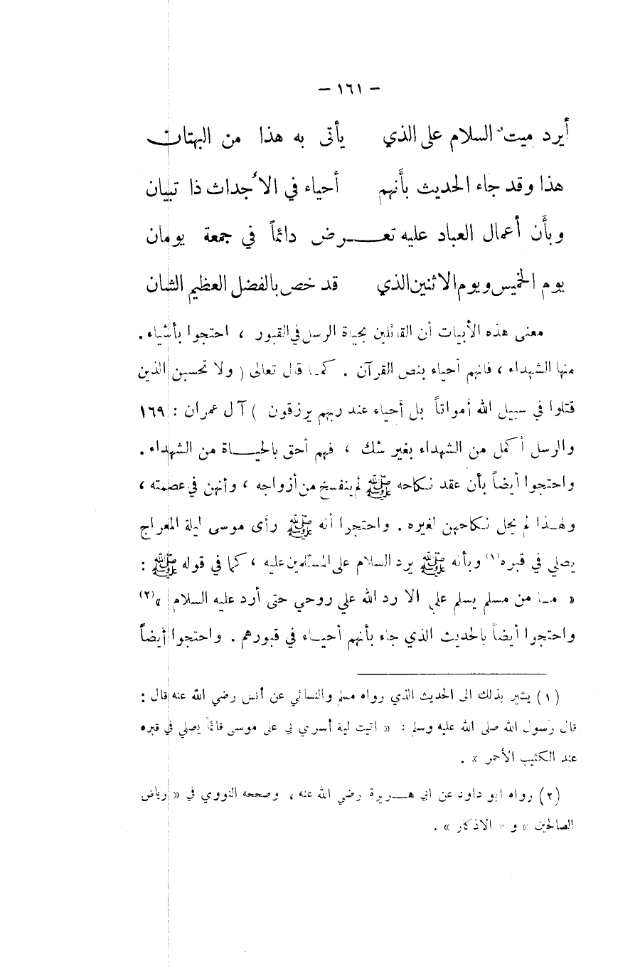 معنى هَذِه الأبيات أَن الْقَائِلين بحياة الرُّسُل فِي الْقُبُور احْتَجُّوا بأَشْيَاء مِنْهَا الشُّهَدَاء فانهم أَحيَاء بِنَصّ الْقُرْآن كَمَا قَالَ تَعَالَى {وَلَا تحسبن الَّذين قتلوا فِي سَبِيل الله أَمْوَاتًا بل أَحيَاء عِنْد رَبهم يرْزقُونَ} آل عمرَان وَالرسل أكمل من الشُّهَدَاء بِغَيْر شكّ فهم احق بِالْحَيَاةِ من الشُّهَدَاء وَاحْتَجُّوا أَيْضا بِأَن عقد نِكَاحه صلى الله عَلَيْهِ وَسلم لم يَنْفَسِخ من أَزوَاجه وأنهن فِي عصمته وَلِهَذَا لم يحل نِكَاحهنَّ لغيره وَاحْتَجُّوا أَنه صلى الله عَلَيْهِ وَسلم رأى مُوسَى لَيْلَة الْمِعْرَاج يُصَلِّي فِي قَبره وَبِأَنَّهُ صلى الله عَلَيْهِ وَسلم يرد السَّلَام على الْمُسلمين عَلَيْهِ كَمَا فِي قَوْله صلى الله عَلَيْهِ وَسلم مَا من مُسلم يسلم عَليّ الا رد الله عَليّ روحي حَتَّى ارد عَلَيْهِ السَّلَام وَاحْتَجُّوا أَيْضا بِالْحَدِيثِ الَّذِي جَاءَ بِأَنَّهُم أَحيَاء فِي قُبُورهم وَاحْتَجُّوا أَيْضا