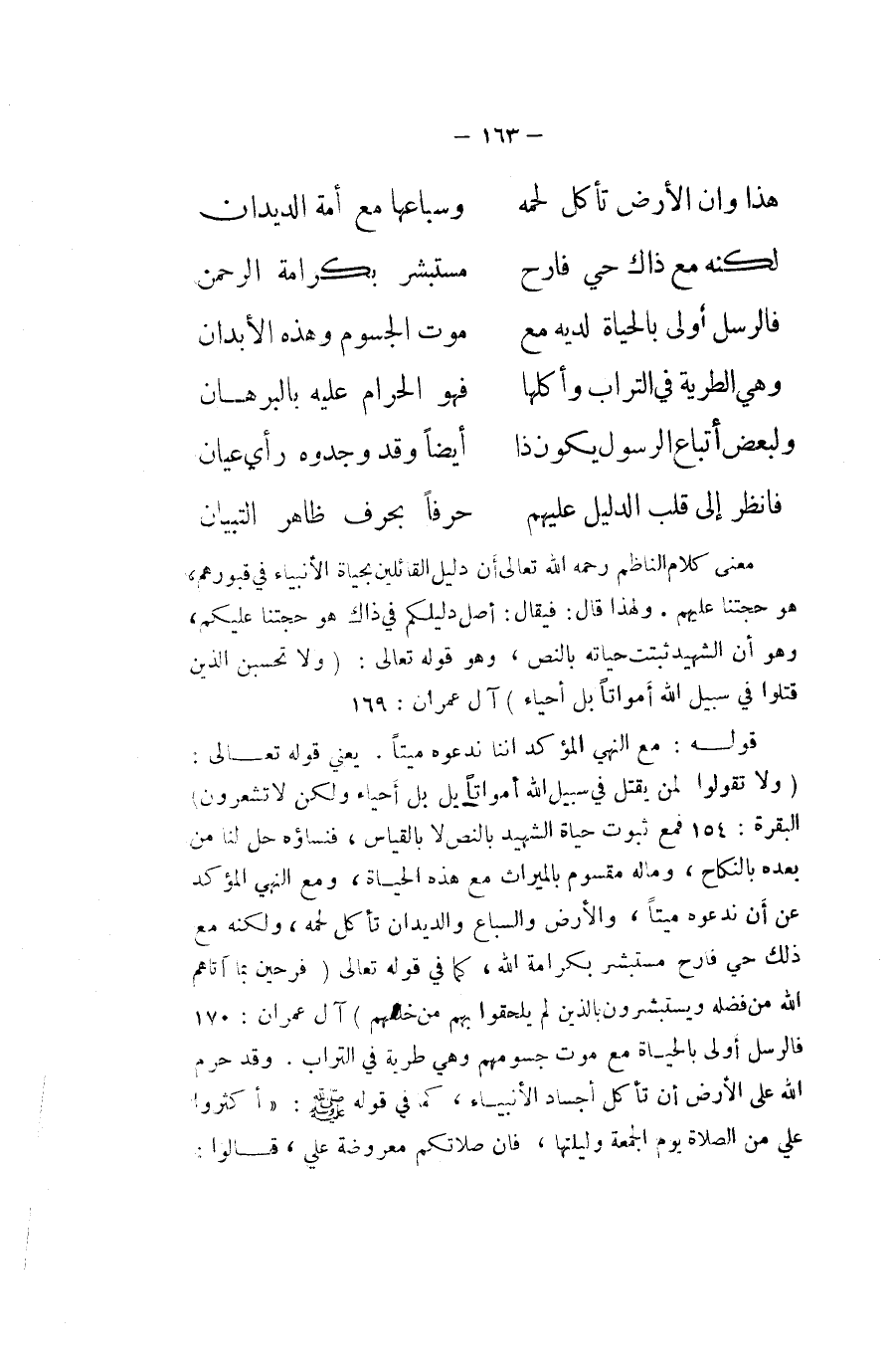 معنى كَلَام النَّاظِم رَحمَه الله تَعَالَى أَن دَلِيل الْقَائِلين بحياة الْأَنْبِيَاء فِي قُبُورهم هُوَ حجتنا عَلَيْهِم وَلِهَذَا قَالَ فَيُقَال أصل دليلكم فِي ذَاك هُوَ حجتنا عَلَيْكُم وَهُوَ ان الشَّهِيد ثبتَتْ حَيَاته بِالنَّصِّ وَهُوَ قَوْله تَعَالَى {وَلَا تحسبن الَّذين قتلوا فِي سَبِيل الله أَمْوَاتًا بل أَحيَاء} آل عمرَان