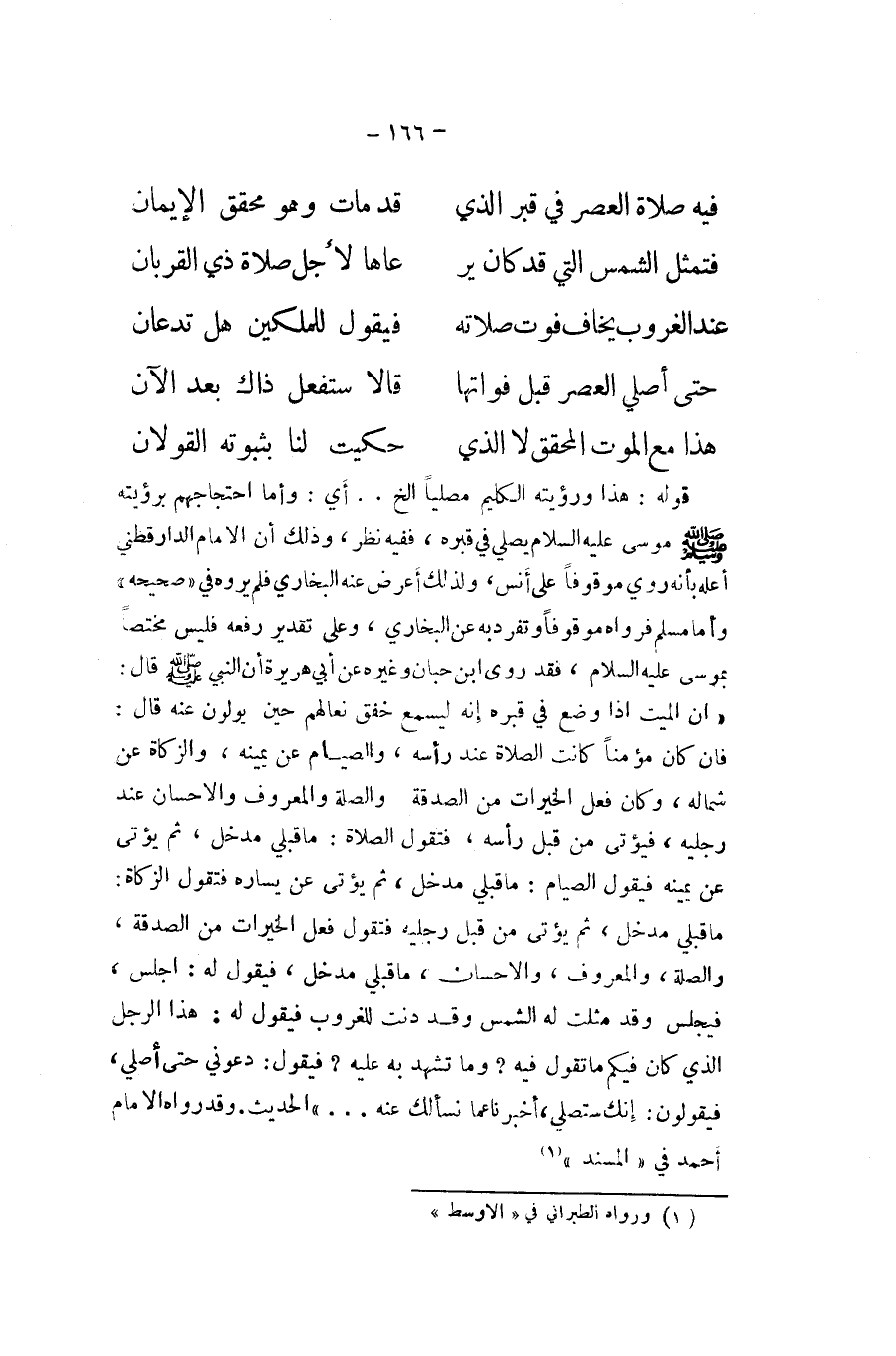قَوْله هَذَا ورؤيته الكليم مُصَليا الخ أَي وَأما احتجاجهم بِرُؤْيَتِهِ صلى الله عَلَيْهِ وَسلم مُوسَى عَلَيْهِ السَّلَام يُصَلِّي فِي قَبره فَفِيهِ نظر وَذَلِكَ ان الامام الدَّارَقُطْنِيّ اعله بِأَنَّهُ رُوِيَ مَوْقُوفا على أنس وَلذَلِك أعرض عَنهُ البُخَارِيّ فَلم يروه فِي صَحِيحه وَأما مُسلم فَرَوَاهُ مَوْقُوفا وَتفرد بِهِ عَن البُخَارِيّ وعَلى تَقْدِير رَفعه فَلَيْسَ مُخْتَصًّا بمُوسَى عَلَيْهِ السَّلَام فقد روى ابْن حبَان وَغَيره عَن ابي هُرَيْرَة ان النَّبِي صلى الله عَلَيْهِ وَسلم قَالَ ان الْمَيِّت اذا وضع فِي قَبره إِنَّه ليسمع خَفق نعَالهمْ حِين يولون عَنهُ قَالَ فان كَانَ مُؤمنا كَانَت الصَّلَاة عِنْد رَأسه وَالصِّيَام عَن يَمِينه وَالزَّكَاة عَن شِمَاله وَكَانَ فعل الْخيرَات من الصَّدَقَة والصلة وَالْمَعْرُوف والاحسان عِنْد رجلَيْهِ فَيُؤتى من قبل رَأسه فَتَقول الصَّلَاة مَا قبلي مدْخل ثمَّ يُؤْتى عَن يَمِينه فَيَقُول الصّيام مَا قبلي مدْخل ثمَّ يُؤْتى عَن يسَاره فَتَقول الزَّكَاة مَا قبلي مدْخل ثمَّ يُؤْتى من قبل رجلَيْهِ فَتَقول فعل الْخيرَات من الصَّدَقَة والصلة وَالْمَعْرُوف والاحسان مَا قبلي مدْخل فَيَقُول لَهُ اجْلِسْ فيجلس وَقد مثلت لَهُ الشَّمْس وَقد دنت للغروب فَيَقُول لَهُ هَذَا الرجل الَّذِي كَانَ فِيكُم مَا تَقول فِيهِ وَمَا تشهد بِهِ عَلَيْهِ فَيَقُول دَعونِي حَتَّى اصلي فَيَقُولُونَ إِنَّك ستصلي أخبرنَا عَمَّا نَسْأَلك عَنهُ الحَدِيث وَقد رَوَاهُ الامام أَحْمد فِي الْمسند