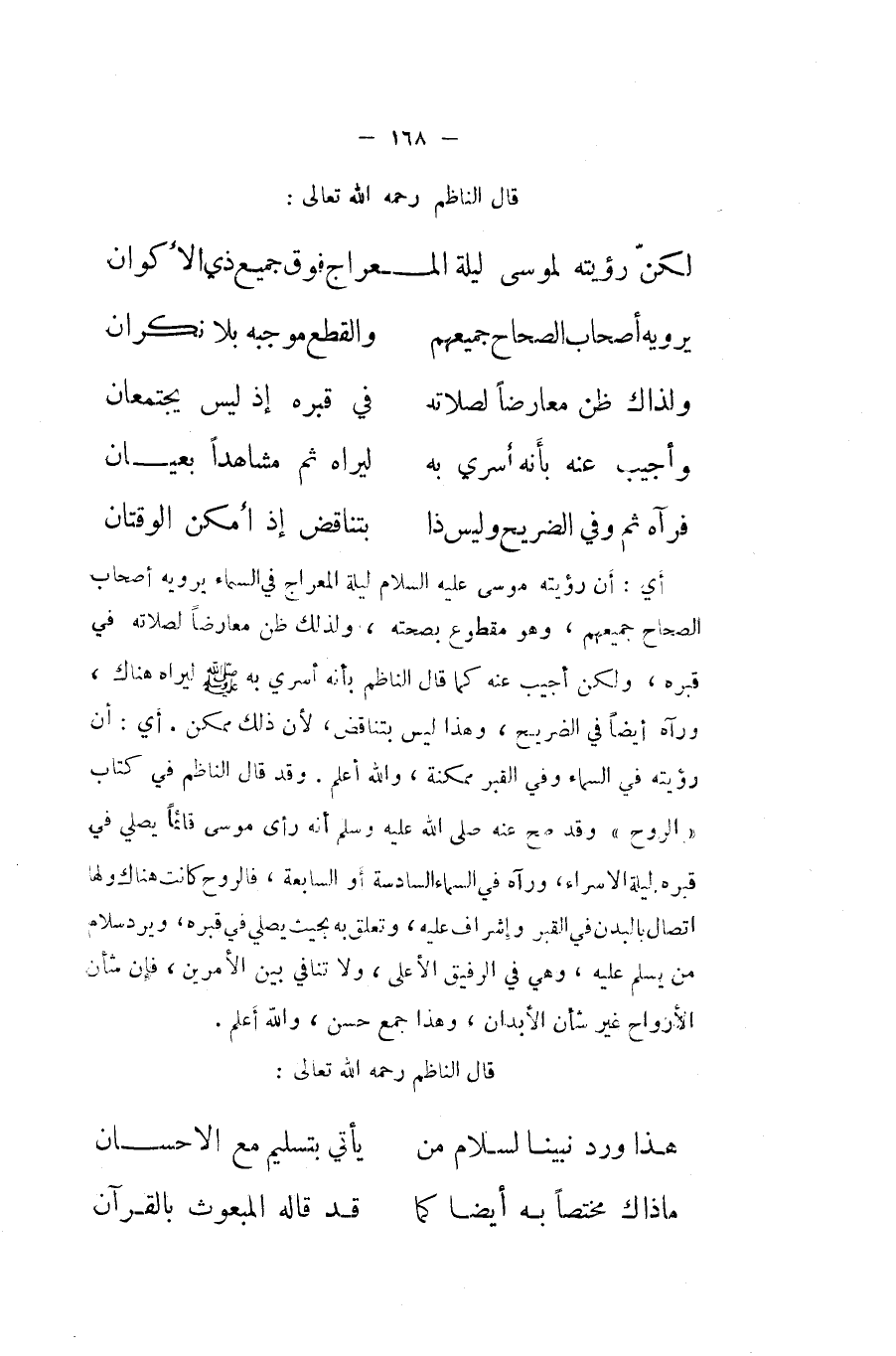 أَي أَن رُؤْيَته مُوسَى عَلَيْهِ السَّلَام لَيْلَة الْمِعْرَاج فِي السَّمَاء يرويهِ أَصْحَاب الصِّحَاح جَمِيعهم وَهُوَ مَقْطُوع بِصِحَّتِهِ وَلذَلِك ظن مُعَارضا لصلاته فِي قَبره وَلَكِن أُجِيب عَنهُ كَمَا قَالَ النَّاظِم بِأَنَّهُ أسرِي بِهِ صلى الله عَلَيْهِ وَسلم ليراه هُنَاكَ وَرَآهُ أَيْضا فِي الضريح وَهَذَا لَيْسَ بتناقض لِأَن ذَلِك مُمكن أَي أَن رُؤْيَته فِي السَّمَاء وَفِي الْقَبْر مُمكنَة وَالله اعْلَم وَقد قَالَ النَّاظِم فِي كتاب الرّوح وَقد صَحَّ عَنهُ صلى الله عَلَيْهِ وَسلم أَنه رأى مُوسَى قَائِما يُصَلِّي فِي قَبره لَيْلَة الاسراء وَرَآهُ فِي السَّمَاء السَّادِسَة أَو السَّابِعَة فالروح كَانَت هُنَاكَ وَلها اتِّصَال بِالْبدنِ فِي الْقَبْر واشراف عَلَيْهِ وَتعلق بِهِ بِحَيْثُ يُصَلِّي فِي قَبره وَيرد سَلام من يسلم عَلَيْهِ وَهِي فِي الرفيق الاعلى وَلَا تنَافِي بَين الْأَمريْنِ فَإِن شَأْن الْأَرْوَاح غير شَأْن الْأَبدَان وَهَذَا جمع حسن وَالله أعلم
