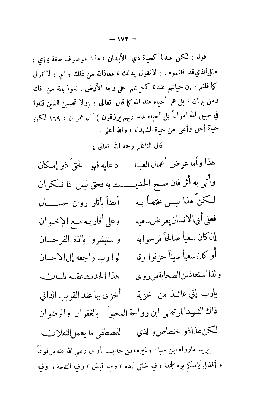 ... هَذَا واما عرض أَعمال العبا ... د عَلَيْهِ فَهُوَ الْحق ذُو إِمْكَان ... وأتى بِهِ اثر فان صَحَّ الحَدِيث بِهِ فَحق لَيْسَ ذَا نكران