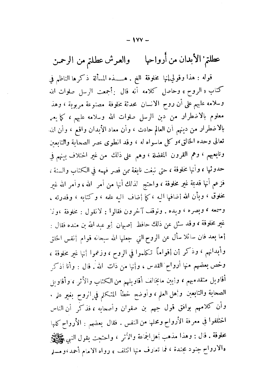 قَوْله هَذَا وَقَوْلِي إِنَّهَا مخلوقة الخ هَذِه الْمَسْأَلَة ذكرهَا النَّاظِم فِي كتاب الرّوح وَحَاصِل كَلَامه انه قَالَ أَجمعت الرُّسُل صلوَات الله وَسَلَامه عَلَيْهِم على ان روح الانسان محدثة مخلوفة مصنوعة مربوبة وَهَذَا مَعْلُوم بالاضطرار من دين الرُّسُل صلوَات الله وَسَلَامه عَلَيْهِم كَمَا يعم بالإضطرار من دينهم أَن الْعَالم حَادث وان معاد الْأَبدَان وَاقع وَأَن الله تَعَالَى وَحده الْخَالِق وكل مَا سواهُ لَهُ وَقد انطوى عصر الصَّحَابَة وَالتَّابِعِينَ وتابعيهم وهم الْقُرُون المفضلة وهم على ذَلِك من غير اخْتِلَاف بَينهم فِي حدوثها وَأَنَّهَا مخلوقة حَتَّى نبغت نَابِغَة مِمَّن قصر فهمه فِي الْكتاب وَالسّنة فَزعم أَنَّهَا قديمَة غير مخلوقة حَتَّى نبغت نَابِغَة مِمَّن قصر فهمه فِي الْكتاب وَالسّنة ن فَزعم انها قديمَة غير مخلوقة وَاحْتج لذَلِك انها من امْر الله وامر الله غير مَخْلُوق وَبِأَن الله أضافها اليه كَمَا أضَاف اليه علمه وَكتابه وَقدرته وسَمعه وبصره وَيَده وَتوقف آخَرُونَ فَقَالُوا لَا نقُول مخلوقة وَلَا غير مخلوقة وَقد سُئِلَ عَن ذَلِك حَافظ اصبهان أَبُو عبد الله بن مَنْدَه فَقَالَ اما بعد فان سَائِلًا سَأَلَ عَن الرّوح الَّتِي جعلهَا الله سُبْحَانَهُ قوام أنفس الْخلق وأبدانهم وَذكر ان اقواما تكلمُوا فِي الرّوح وَزَعَمُوا انها غير مخلوقة وَخص بَعضهم مِنْهَا أَرْوَاح الْقُدس وَأَنَّهَا من ذَات الله قَالَ وَأَنا أذكر أقاويل متقدميهم وَأبين مَا يُخَالف أقاويلهم من الْكتاب والأثر وأقاويل الصَّحَابَة وَالتَّابِعِينَ وَأهل الْعلم وأوضح خطأ الْمُتَكَلّم فِي الرّوح بِغَيْر علم وان كَلَامهم يُوَافق قَول جهم بن صَفْوَان وَأَصْحَابه فَذكر ان النَّاس اخْتلفُوا فِي معرفَة الْأَرْوَاح ومحلها من النَّفس فَقَالَ بَعضهم الارواح كلهَا مخلوقة قَالَ وَهَذَا مَذْهَب اهل الْجَمَاعَة والأثر واحتجت بقول النَّبِي صلى الله عَلَيْهِ وَسلم الارواح جنود مجندة فَمَا تعارف مِنْهَا ائتلف رَوَاهُ الامام أَحْمد وَمُسلم