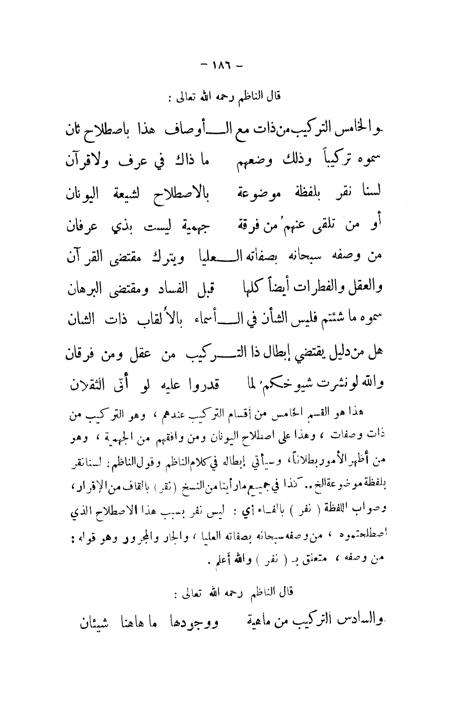 هَذَا هُوَ الْقسم الْخَامِس من اقسام التَّرْكِيب عِنْدهم وَهُوَ التَّرْكِيب من ذَات وصفات وَهَذَا على اصْطِلَاح اليونان وَمن وافقهم من الْجَهْمِية وَهُوَ من أظهر الْأُمُور بطلانا وَسَيَأْتِي إِبْطَاله فِي كَلَام النَّاظِم وَقَول النَّاظِم لسنا نقر بِلَفْظَة مَوْضُوعَة الخ كَذَا فِي جَمِيع مَا رَأينَا من النّسخ نقر بِالْقَافِ من الْإِقْرَار وصواب اللَّفْظَة نفر بِالْفَاءِ أَي لَيْسَ نفر بِسَبَب هَذَا الِاصْطِلَاح الَّذِي اصطلحتموه من وَصفه سُبْحَانَهُ بصفاته الْعليا وَالْجَار وَالْمَجْرُور وَهُوَ قَوْله من وَصفه مُتَعَلق ب نفر وَالله اعْلَم