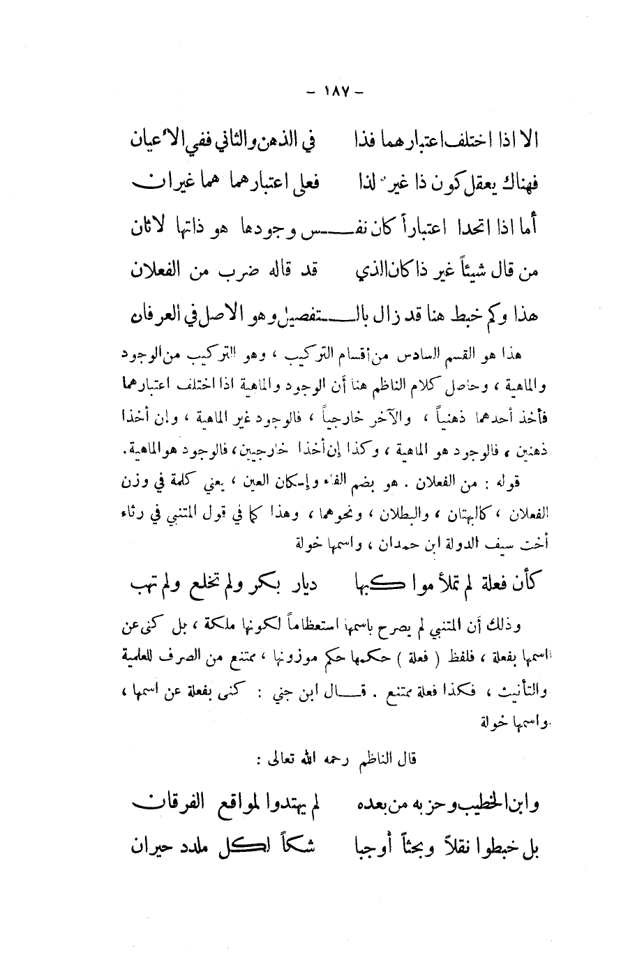 أما اذا اتَّحد اعْتِبَارا كَانَ نفس وجودهَا هُوَ ذَاتهَا لَا ثَان ... من قَالَ شَيْئا غير ذَا كَانَ الَّذِي ... قد قَالَه ضرب من الفعلان ... هَذَا وَكم خبط هُنَا قد زَالَ بالتفصيل وَهُوَ الاصل فِي العرفات ...