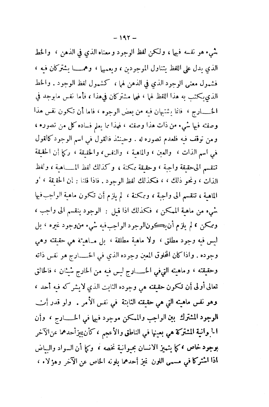 شَيْء هُوَ نَفسه فيهمَا وَلَكِن لفظ الْوُجُود وَمَعْنَاهُ الَّذِي فِي الذِّهْن والخط الَّذِي يدل على اللَّفْظ يتَنَاوَل الْمَوْجُودين ويعمهما يَشْتَرِكَانِ فِيهِ فشمول معنى الْوُجُود الَّذِي فِي الذِّهْن لَهما كشمول لفظ الْوُجُود والخط الَّذِي يكْتب بِهِ هَذَا اللَّفْظ لَهما فهما مشتركان فِي هَذَا فَأَما نفس مَا يُوجد فِي الْخَارِج فانما يشتبهان فِيهِ من بعض الْوُجُوه فاما ان تكون نفس هَذَا وَصفته فِيهَا شَيْء من ذَات هَذَا وَصفته فَهَذَا مِمَّا يعلم فَسَاده كل من تصَوره وَمن توقف فِيهِ فلعدم تصَوره لَهُ وَحِينَئِذٍ فَالْقَوْل فِي اسْم الْوُجُود كالقول فِي اسْم الذَّات وَالْعين والماهية وَالنَّفس والحقيقة وكما ان الْحَقِيقَة تَنْقَسِم الى حَقِيقَة وَاجِبَة وَحَقِيقَة مُمكنَة وَكَذَلِكَ لفظ الْمَاهِيّة وَلَفظ الذَّات وَنَحْو ذَلِك فَكَذَلِك لفظ الْوُجُود فاذا قُلْنَا إِن الْحَقِيقَة أَو الْمَاهِيّة تَنْقَسِم الى وَاجِبَة وممكنة لم يلْزم أَن تكون مَاهِيَّة الْوَاجِب فِيهَا شَيْء من مَاهِيَّة الْمُمكن فَكَذَلِك اذا قيل الْوُجُود يَنْقَسِم الى وَاجِب وممكن لم يلْزم أَن يكون مَاهِيَّة الْوَاجِب فِيهَا شئ من مَاهِيَّة الْمُمكن فَكَذَلِك اذا قيل الْوُجُود يَنْقَسِم الى وَاجِب وممكن لم يلْزم أَن يكون الْوُجُود الْوَاجِب فِيهِ شَيْء من وجود غَيره بل لَيْسَ فِيهِ وجود مُطلق وَلَا مَاهِيَّة مُطلقَة بل ماهيته هِيَ حَقِيقَته وَهِي وجوده واذا كَانَ الْمَخْلُوق الْمعِين وجوده الَّذِي فِي الْخَارِج هُوَ نفس ذَاته وَحَقِيقَته وماهيته الَّتِي فِي الْخَارِج لَيْسَ فِيهِ من الْخَارِج شَيْئَانِ فالخالق تَعَالَى أولى أَن تكون حَقِيقَته هِيَ وجوده الثَّابِت الَّذِي لَا يشركهُ فِيهِ أحد وَهُوَ نفس ماهيته الَّتِي هِيَ حَقِيقَته الثابته فِي نفس الْأَمر وَلَو قدر أَن الْوُجُود الْمُشْتَرك بَين الْوَاجِب والممكن مَوْجُود فيهمَا فِي الْخَارِج وَأَن الجوانية الْمُشْتَركَة هِيَ بِعَينهَا فِي النَّاطِق والأعجم كَأَن يُمَيّز أَحدهمَا عَن الآخر بِوُجُود خَاص كَمَا يتَمَيَّز الانسان بحيوانية تخصه وكما ان السوَاد وَالْبَيَاض اذا اشْتَركَا فِي مُسَمّى اللَّوْن تميز أَحدهمَا بلونه الْخَاص عَن الآخر وَهَؤُلَاء