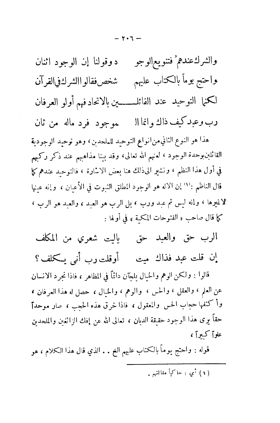لكنما التَّوْحِيد عِنْد الْقَائِلين بالاتحاد فهم اولو الْعرْفَان ... رب وَعبد كَيفَ ذَاك وانما ال ... مَوْجُود فَرد مَاله من ثَان ...