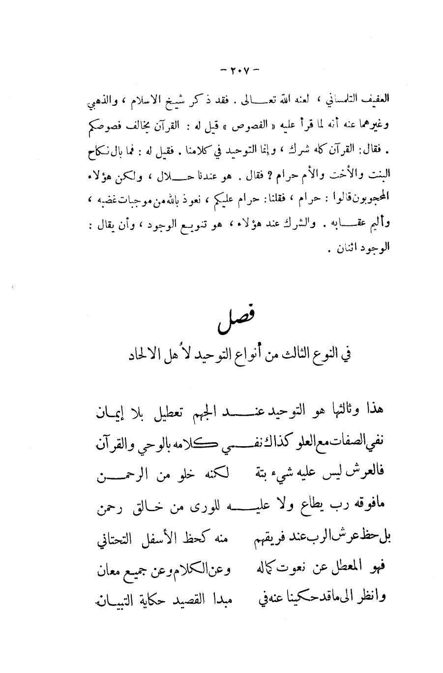 ... هَذَا وَثَالِثهَا هُوَ التَّوْحِيد عِنْد الجهم تَعْطِيل بِلَا إِيمَان ... نفي الصِّفَات مَعَ الْعُلُوّ كَذَاك نفي كَلَامه بِالْوَحْي وَالْقُرْآن
