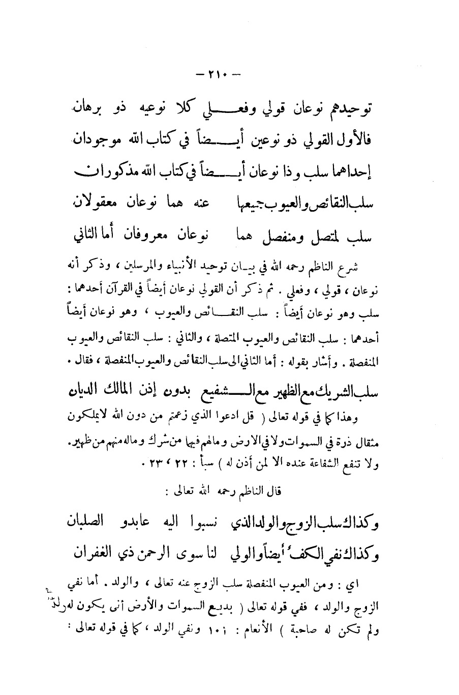 شرع النَّاظِم رَحمَه الله فِي بَيَان تَوْحِيد الْأَنْبِيَاء وَالْمُرْسلِينَ وَذكر أَنه نَوْعَانِ قولي وفعلي ثمَّ ذكر أَن القولي نَوْعَانِ أَيْضا فِي الْقُرْآن أَحدهمَا سلب وَهُوَ نَوْعَانِ أَيْضا سلب النقائص والعيوب وَهُوَ نَوْعَانِ أَيْضا أَحدهمَا سلب النقائص والعيوب الْمُتَّصِلَة وَالثَّانِي سلب النقائص والعيوب الْمُنْفَصِلَة وَأَشَارَ بقوله أما الثَّانِي الى سلب النقائص والعيوب الْمُنْفَصِلَة فَقَالَ ... سلب الشَّرِيك مَعَ الظهير مَعَ الشَّفِيع بِدُونِ إِذن الْمَالِك الديَّان ...