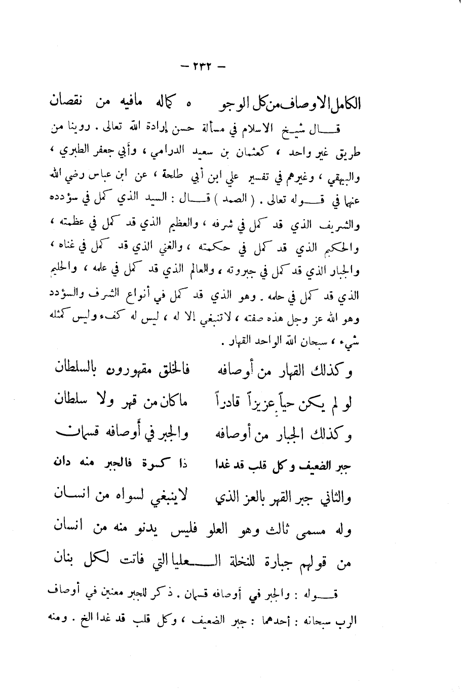 قَالَ شيخ الاسلام فِي مَسْأَلَة حسن إِرَادَة الله تَعَالَى روينَا من طَرِيق غير وَاحِد كعثمان بن سعيد الدَّارمِيّ وابي جَعْفَر الطَّبَرِيّ وَالْبَيْهَقِيّ وَغَيرهم فِي تَفْسِير عَليّ ابْن أبي طَلْحَة عَن ابْن عَبَّاس رَضِي الله عَنْهُمَا فِي قَوْله تَعَالَى {الصَّمد} قَالَ السَّيِّد الَّذِي كمل فِي سؤدده والشريف الَّذِي قد كمل فِي شرفه والعظيم الَّذِي قد كمل فِي عَظمته والحكيم الَّذِي قد كمل فِي حكمته والغني الَّذِي قد كمل فِي غناهُ والجبار الَّذِي قد كمل فِي جبروته والعالم الَّذِي قد كمل فِي علمه والحليم الَّذِي قد كمل فِي حلمه وَهُوَ الَّذِي قد كمل فِي أَنْوَاع الشّرف والسؤدد وَهُوَ الله عز وَجل هَذِه صفته لَا تنبغي إِلَّا لَهُ لَيْسَ لَهُ كفاء وَلَيْسَ كمثله شَيْء سُبْحَانَ الله الْوَاحِد القهار ... وَكَذَلِكَ القهار من اوصافه ... فالخلق مقهورون بالسلطان