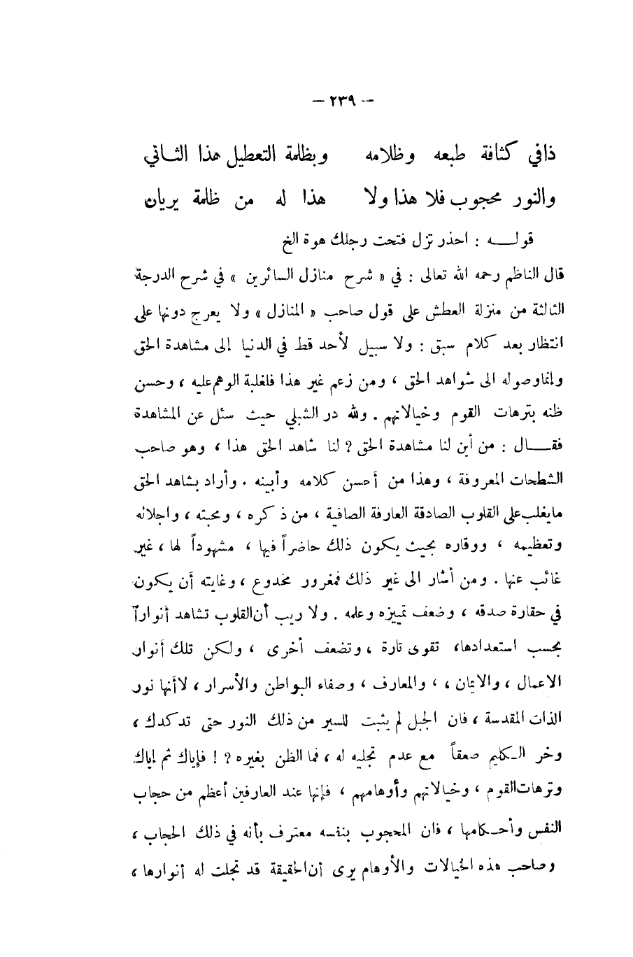قَوْله احذر تزل فتحت رجلك هوة الخ قَالَ النَّاظِم رَحمَه الله تَعَالَى فِي شرح منَازِل السائرين فِي شرح الدرجَة الثَّالِثَة من منزلَة الْعَطش على قَول صَاحب الْمنَازل وَلَا يعرج دونهَا على انْتِظَار بعد كَلَام سبق وَلَا سَبِيل لأحد قطّ فِي الدُّنْيَا إِلَى مُشَاهدَة الْحق وَإِنَّمَا وُصُوله الى شَوَاهِد الْحق وَمن زعم غير هَذَا فلغلبة الْوَهم عَلَيْهِ وَحسن ظَنّه بترهات الْقَوْم وخيالاتهم وَللَّه در الشبلي حَيْثُ سُئِلَ عَن الْمُشَاهدَة فَقَالَ من أَيْن لنا مُشَاهدَة الْحق لنا شَاهد الْحق هَذَا وَهُوَ صَاحب الشطحات الْمَعْرُوفَة وَهَذَا من أحسن كَلَامه وأبينه وَأَرَادَ بِشَاهِد الْحق مَا يغلب على الْقُلُوب الصادقة العارفة الصافية من ذكره ومحبته واجلاله وتعظيمه ووقاره بِحَيْثُ يكون ذَلِك حَاضرا فِيهَا مشهودا لَهَا غير غَائِب عَنْهَا وَمن أَشَارَ الى غير ذَلِك فمغرور مخدوع وغايته ان يكون فِي حقارة صدقه وَضعف تَمْيِيزه وَعلمه وَلَا ريب ان الْقُلُوب تشاهد أنوارا بِحَسب استعدادها تقوى تَارَة وتضعف أُخْرَى وَلَكِن تِلْكَ انوار الاعمال والايمان والمعارف وصفاء البواطن والاسرار لَا أَنَّهَا نور الذَّات المقدسة فان الْجَبَل لم يثبت للسير من ذَلِك النُّور حَتَّى تدكدك وخر الكليم صعقا مَعَ عدم تجليه لَهُ فَمَا الظَّن بِغَيْرِهِ فإياك ثمَّ إياك وترهات الْقَوْم وخيالاتهم وأوهامهم فَإِنَّهَا عِنْد العارفين أعظم من حجاب النَّفس وأحكامها فَإِن المحجوب بِنَفسِهِ معترف بِأَنَّهُ فِي ذَلِك الْحجاب وَصَاحب هَذِه الخيالات والأوهام يرى ان الْحَقِيقَة قد تجلت لَهُ أنوارها