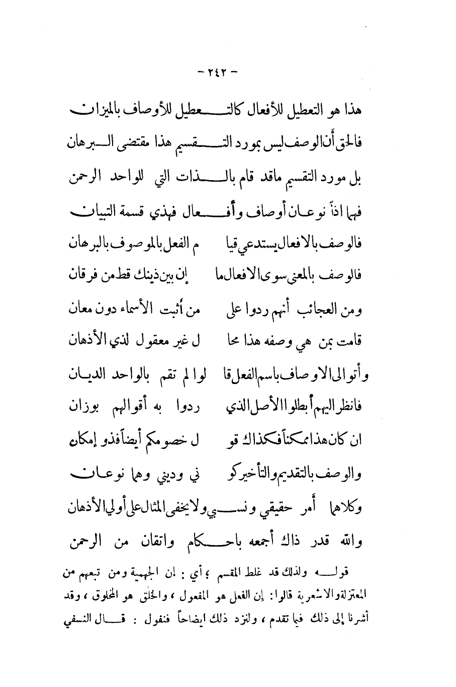 فهما اذا نَوْعَانِ اوصاف وأفعال فهذي قسْمَة التِّبْيَان ... فالوصف بالافعال يَسْتَدْعِي قيا ... م الْفِعْل بالموصوف بالبرهان ... فالوصف بِالْمَعْنَى سوى الافعال مَا ... إِن بَين ذَيْنك قطّ من فرقان